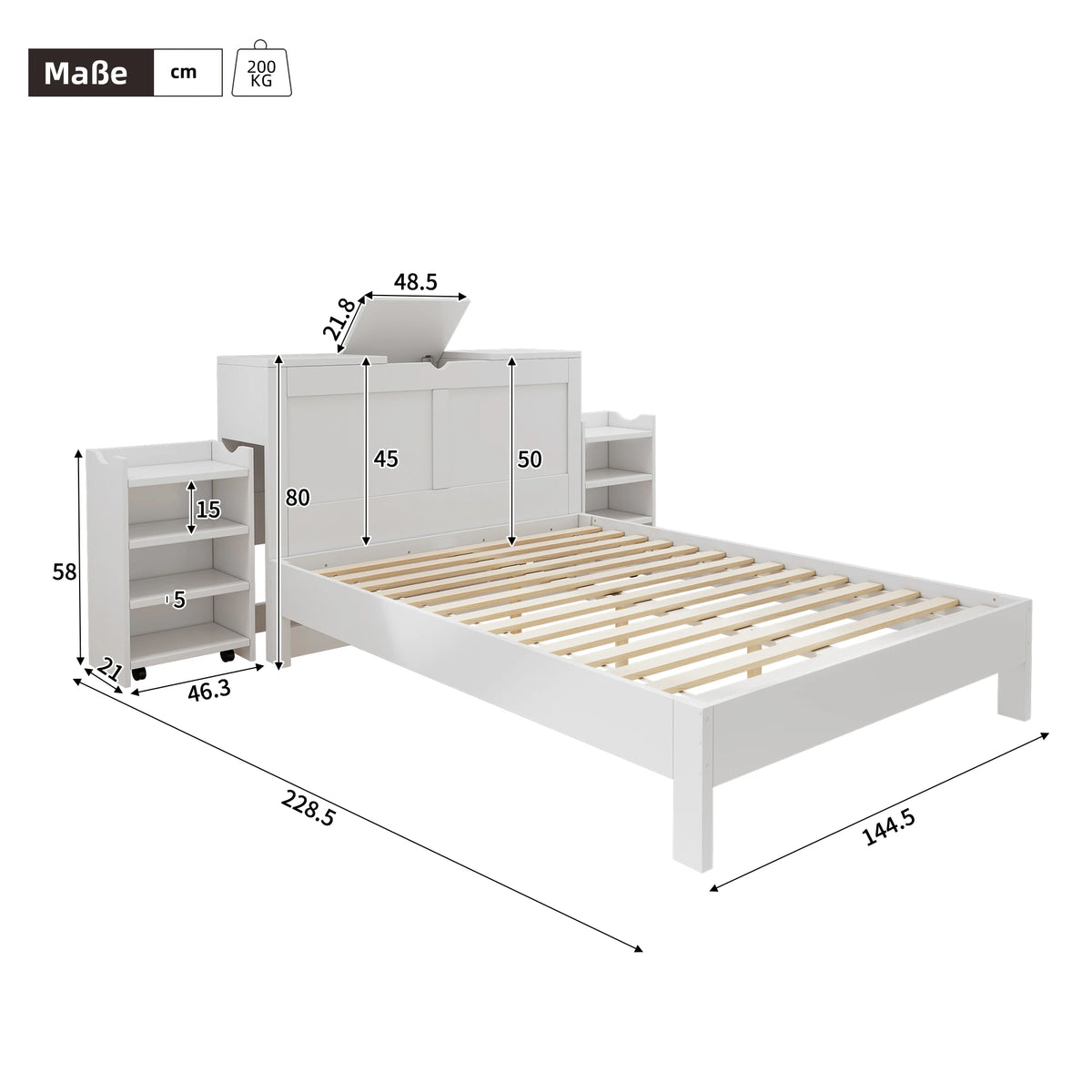 - 1 x 140x200 bijeli okvir kreveta s uzglavljem koji sadrži dva izvučena noćna ormarića i skrivenu kutiju za pohranu