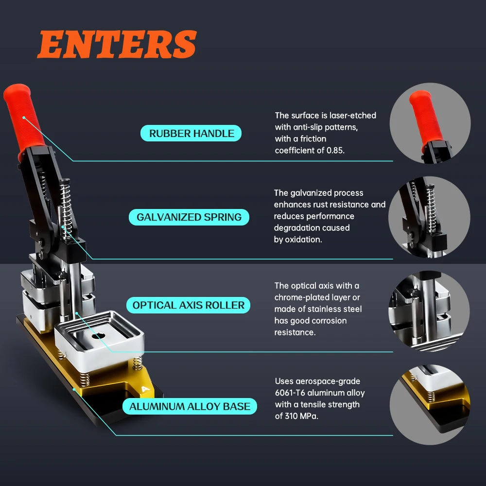 Ovaj stroj za izradu magnetskih naljepnica ima kompaktne dimenzije od 30*8*40cm, proizvodeći konačne magneta veličine 50*50mm. Dizajniran je s upečatljivom crvenom, zlatnom i crnom shemom boja za profesionalan izgled, i radi ručno za jednostavnu, praktičnu kontrolu. Potječe iz kontinentalne Kine i izradila ga je ugledna marka, savršen je za DIY entuzijaste koji traže pouzdanu izvedbu.
