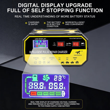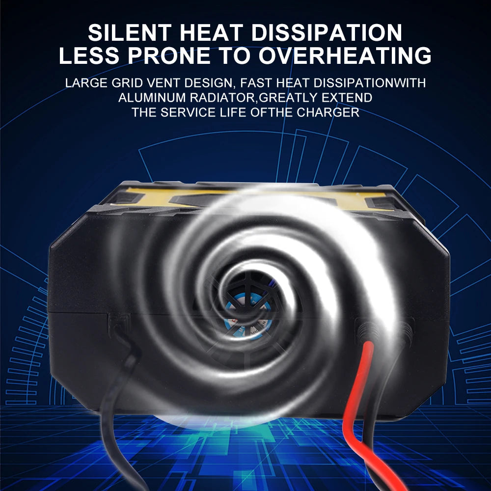Uz višestepeno punjenje, punjač pažljivo upravlja strujom dok se baterija puni, smanjujući toplinu i minimizirajući habanje vaše baterije. LED inteligentni digitalni zaslon automatski prepoznaje razinu snage baterije, struju i napon, te detektira 12V ili 24V sustave kako bi prilagodio struju punjenja. Inteligentna kontrola čipa omogućava precizno upravljanje, dok automatsko zaustavljanje punjenja punom snagom i inteligentna zaštita pomažu vam da punite s mirom. Ventilator održava temperature pod kontrolom, a višestruke zaštitne mjere štite i punjač i vašu bateriju tijekom rada.