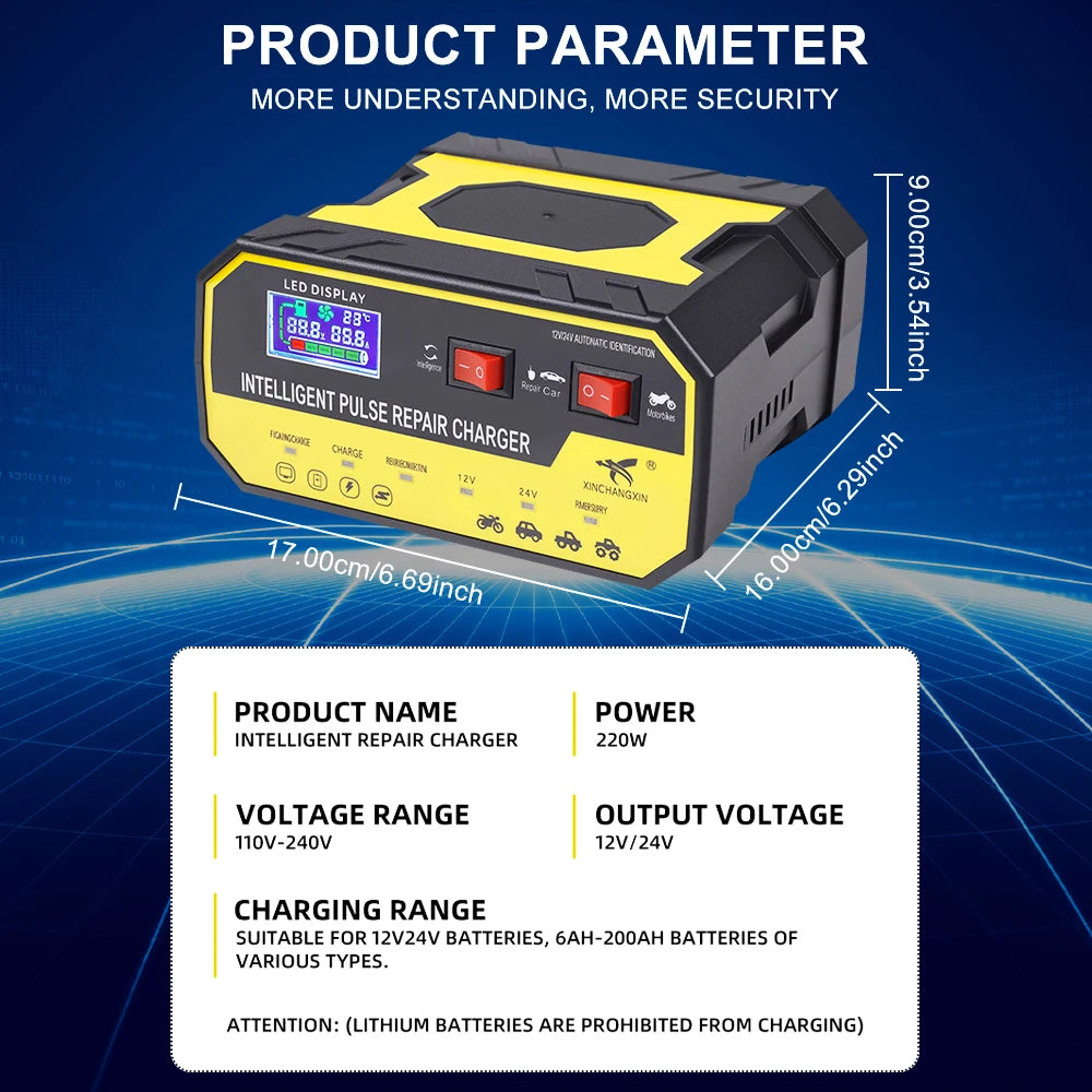 220W punjač za automobilske baterije 12V 24V 8A automatski prekidač s pulsnom reparacijom je vaše pametno rješenje za pouzdanu energiju vozila. Dizajniran za oživljavanje umornih baterija i zaštitu za duži vijek trajanja, ovaj punjač koristi visoko-frekventnu pulsnu inteligentnu reparaciju kako bi riješio uobičajene probleme s baterijama kao što su nedovoljna snaga, napon i visoki unutarnji otpor. Rezultat? Oštriji startovi, stabilnija električna izvedba i manje skakanja u hladnom vremenu.