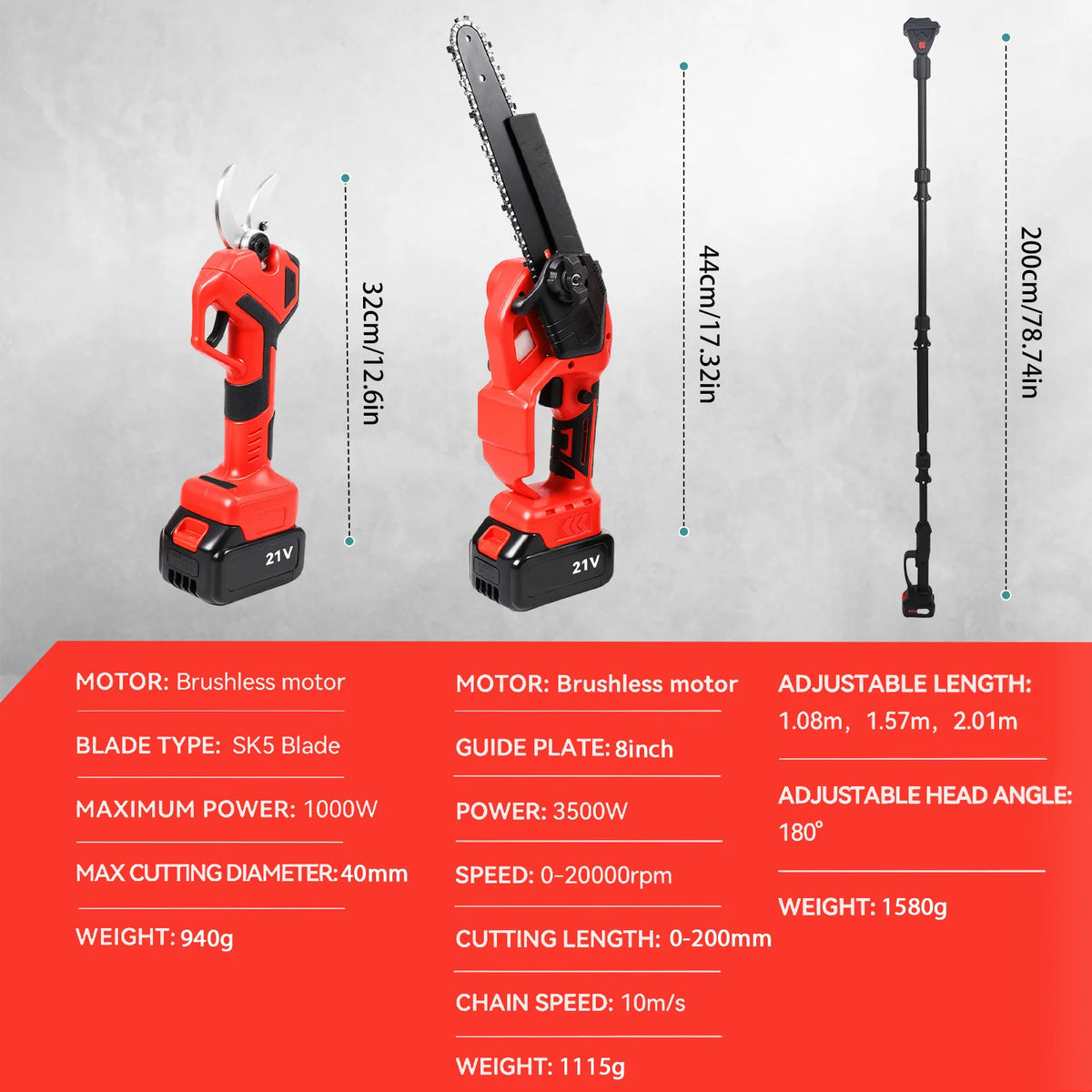 Opremljen promjerom motorne pile od 0-200 mm, reznom glavom sposobnom za rezove od 0-40 mm i kompaktnim, ali snažnim izlazom od 3500W, lako ćete obaviti zadatke od obrezivanja do uklanjanja grana. Digitalni zaslon vas obavještava o razini baterije i broju rezanja, pomažući vam da planirate svaku sesiju. S maksimalnom brzinom od 0-20.000 RPM, ovaj alat omogućuje brze, kontrolirane rezove dok održava prenosivost s uključenom baterijom i punjačem od 1A. Vrijeme rada traje oko 40-50 minuta, ovisno o korištenju, tako da možete obaviti projekte u jednom punjenju.