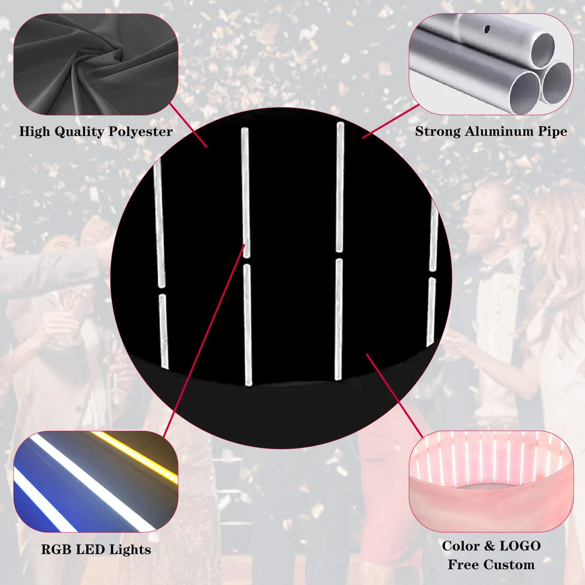 Upoznajte 360 Photo Booth Enclosure With LED RGB Lights For Weddings od WideMeet — elegantan, izdržljiv set dizajniran za pretvaranje trenutaka u nezaboravne, dijeljive doživljaje. Njegov aluminijski okvir s tkaninskim kućištem pruža čistu, profesionalnu pozadinu za zapanjujuće 360-stupnjeve fotografije, dok RGB LED rasvjeta dodaje prilagodljivu atmosferu koja odgovara vašoj shemi boja vjenčanja ili temi zabave. Uz besplatnu opciju prilagođenog logotipa, možete prikazati svoj brend ili mjesto za uglađen, personaliziran izgled na prijemima, zabavama i događanjima.
