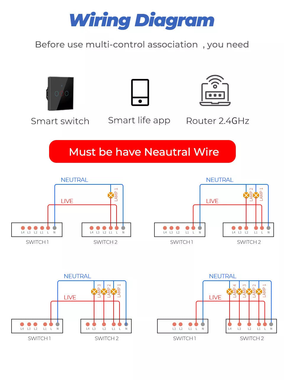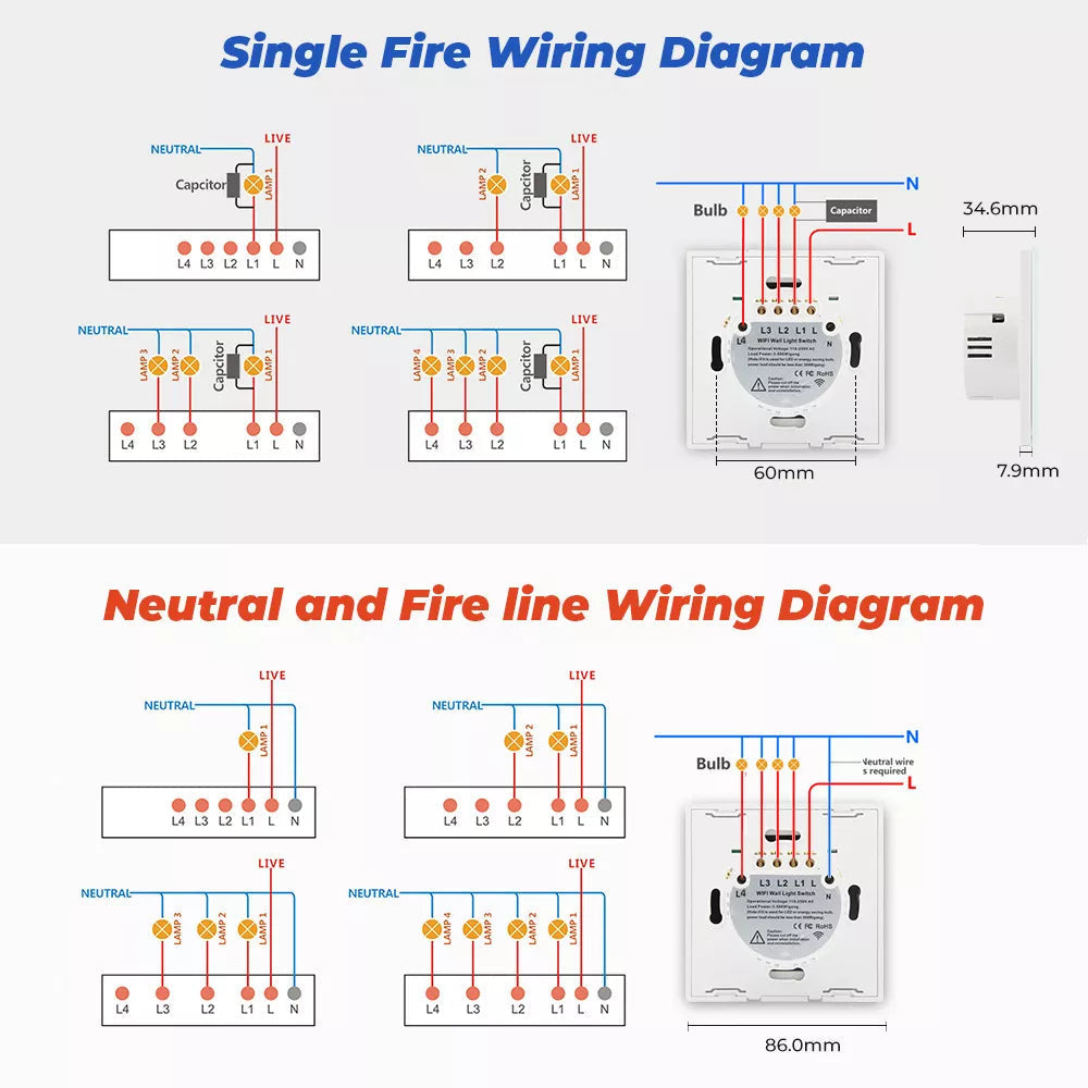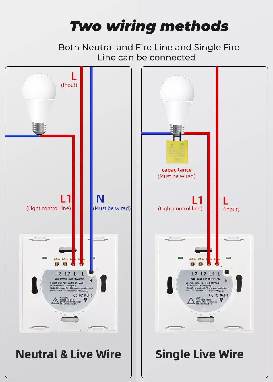 - Način ožičenja: neutralni faza + jednofazni prekidač