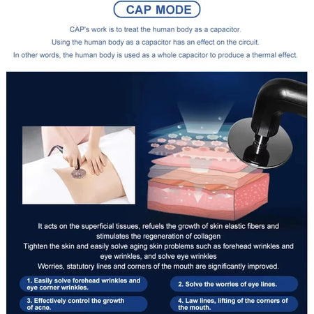 Ovaj napredni TECAR terapijski sustav koristi kapacitivni i otpornički električni prijenos za stvaranje duboke termoterapije. Isporukom energije između aktivnih i neaktivnih elektroda, zagrijava područje tretmana kako bi pomogao normalizaciji funkcije stanica, poboljšao oksigenaciju tkiva, pomogao detoksikaciji oštećenog tkiva i potaknuo sintezu kolagena i elastina. Rezultat je kombinacija smanjenja masti, glađe teksture kože i blagog analgetskog učinka koji podržava oporavak i opće blagostanje.