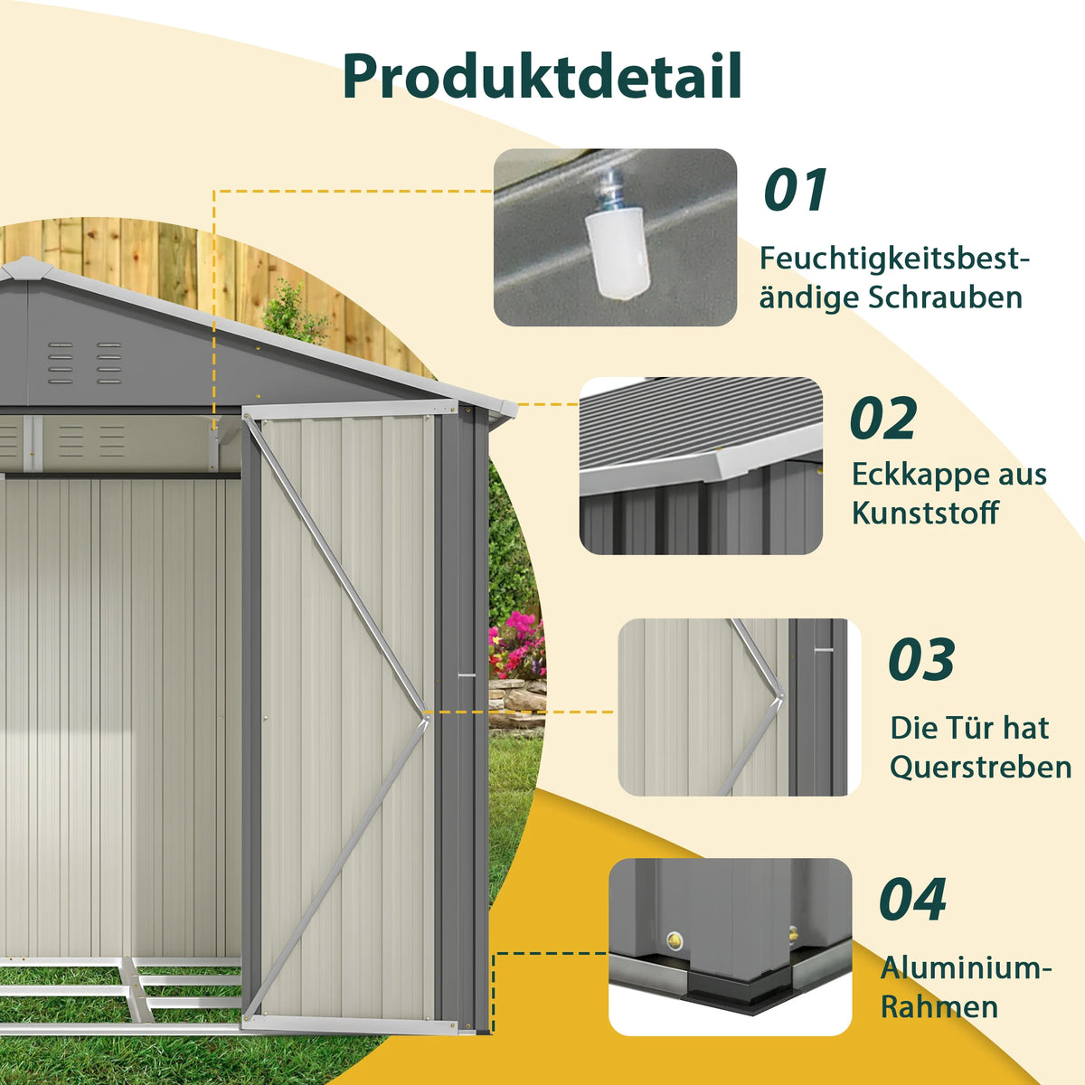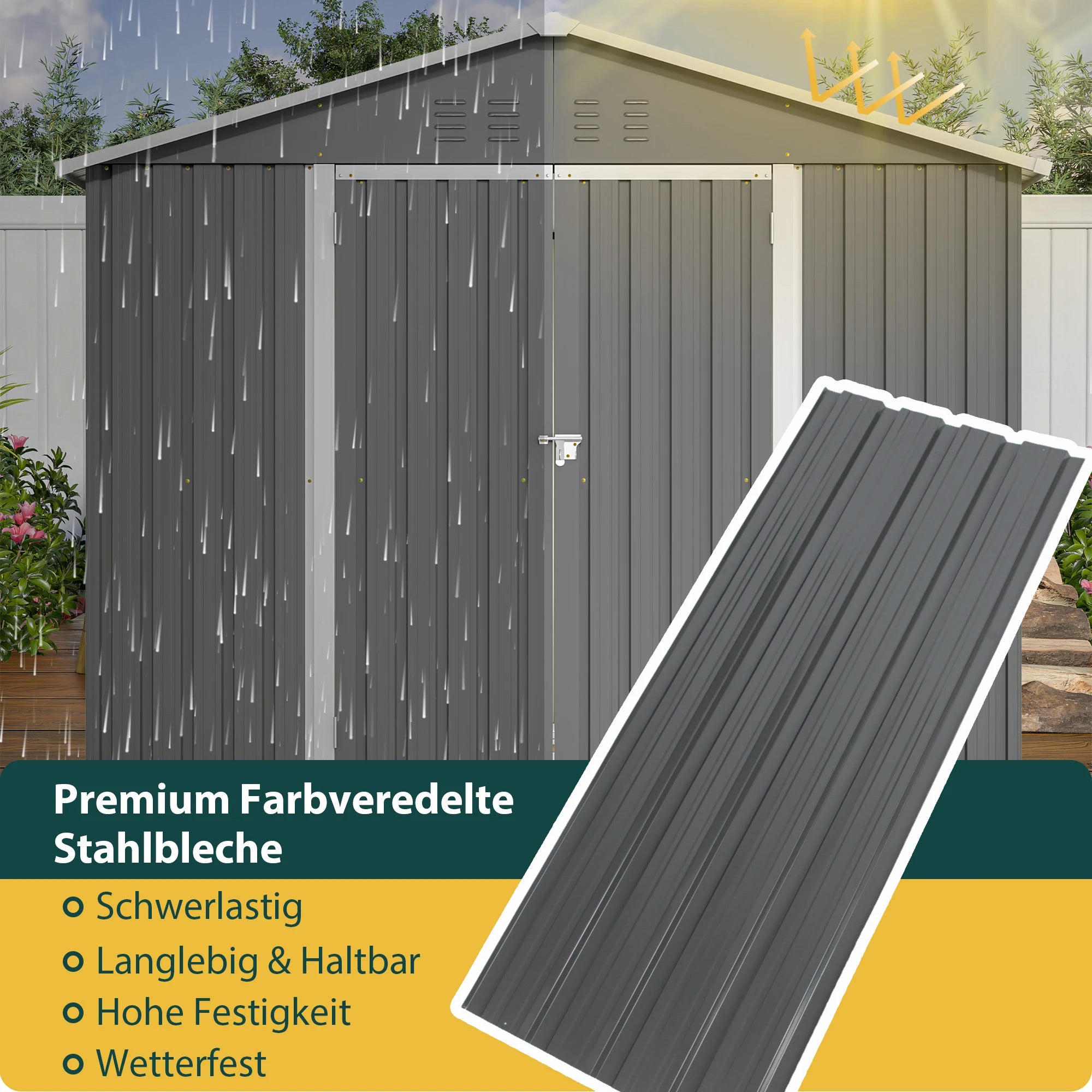 Upoznajte metalnu alatnicu u antracitnoj boji dimenzija 8x6 ft s vodootpornim preklopnim vratima — čvrsto, vremenski otporno rješenje za pohranu za svaki vrt. Izrađena od pocinčanog čeličnog lima u elegantnoj antracitnoj završnoj obradi, ova prostrana alatnica drži kosilice, roštilje, vrtni namještaj i alate suhim i organiziranim tijekom cijele godine. Generozna površina (približno 8x6 ft ili 2,20 x 1,80 m) pruža dovoljno prostora za glomaznu opremu, dok dvodijelna klizna vrata (106 cm široka) omogućuju jednostavan, nesmetan pristup za premještanje velikih predmeta unutra i van. Ventilacijske rešetke potiču protok zraka kako bi se spriječilo nakupljanje vlage i plijesni, pomažući vašoj opremi da ostane u vrhunskom stanju.