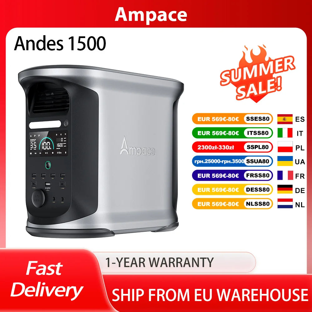 Ampace Andes 1500 prijenosna električna stanica s 1462Wh LiFePO4, 2400W solarni generator, 13 izlaznih priključaka, 6000 ciklusa
