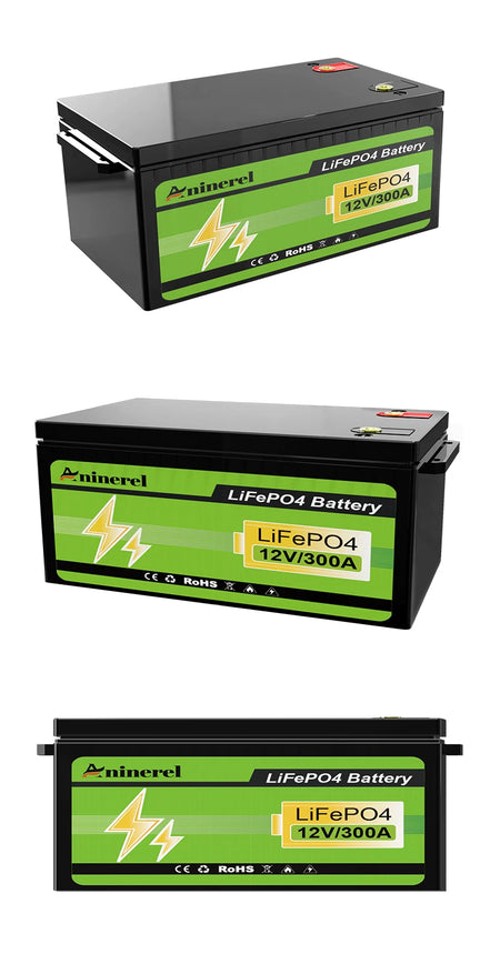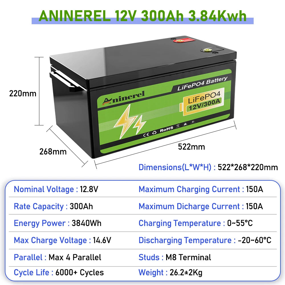 Aninerel 12V 300Ah LiFePO4 baterija s Bluetoothom za kamp-prikolice, golf kolica, kućne solarne sustave, 6000 plus ciklusa, EU skladište