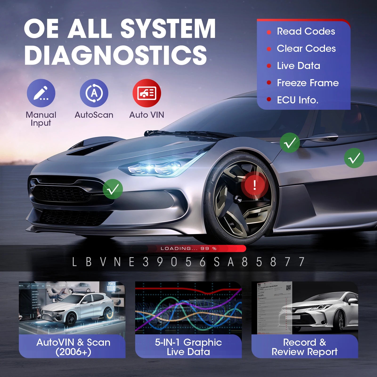 - Moćna dijagnostika: Pošaljite naredbe ECU-ima za aktivne testove, pregledajte podatke u stvarnom vremenu i dijagnosticirajte motore, mjenjače, ABS, zračne jastučiće i još mnogo toga s punim pokrivanjem sustava.