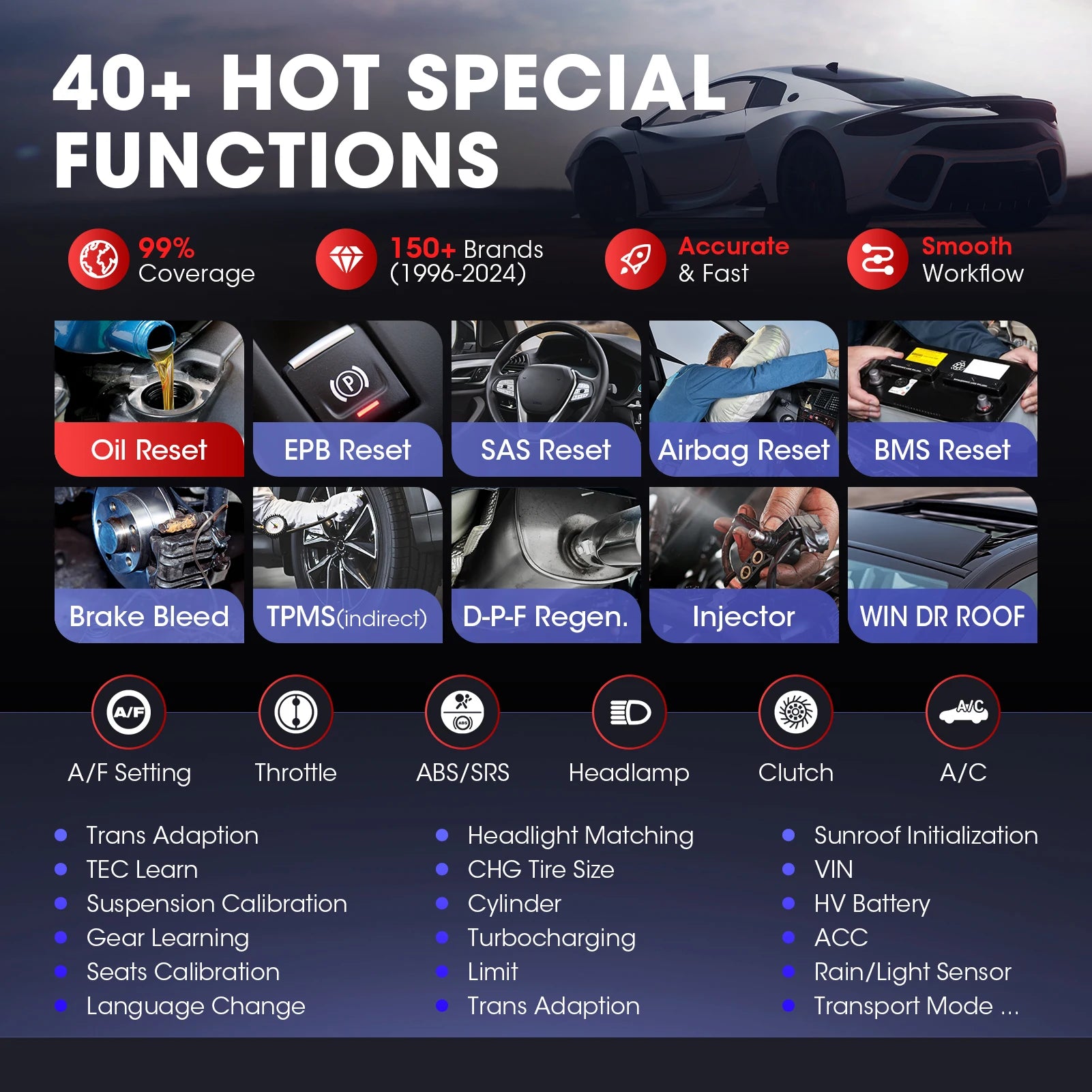 - Održavanje u jednom alatu: Pristupite 40+ funkcija servisa (resetiranje ulja, ABS, SRS, EPB, kalibracija SAS, BMS, prednja svjetla i još mnogo toga) kako biste održali vozila u vrhunskom stanju.