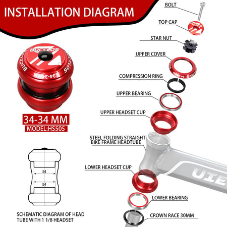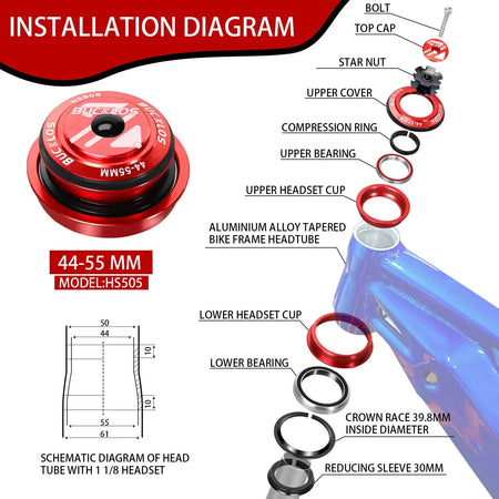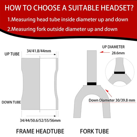 Molimo odaberite ispravnu veličinu headseta kako bi odgovarala cijevi okvira. Ovaj headset je kompatibilan s 28.6mm ravnim cijevima vilice i podržava 1-1/8" sustave bez navoja, uključujući ravne i sužene vilice. Osigurajte pravilnu instalaciju kako biste zaštitili upravljačku cijev i održali pouzdanost.