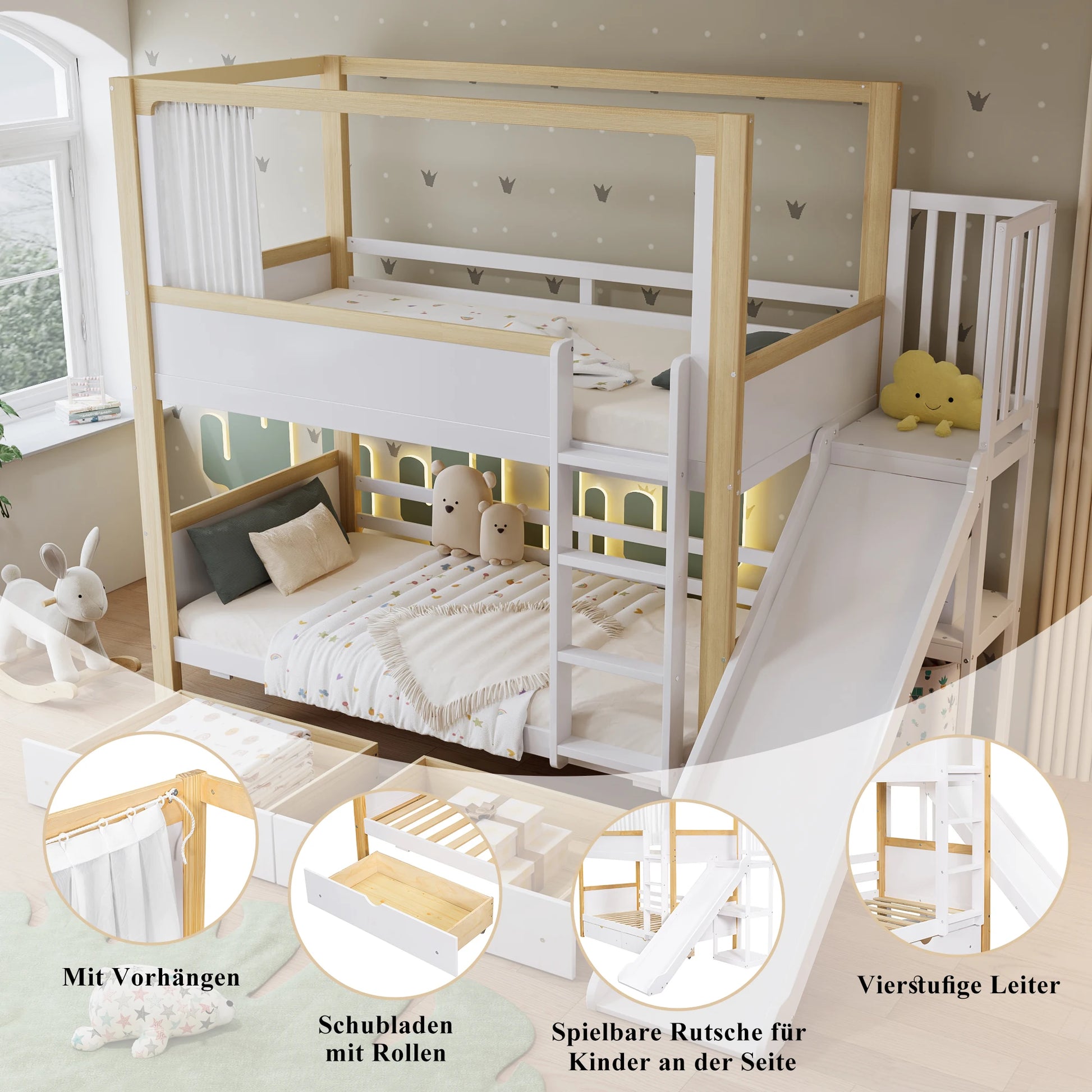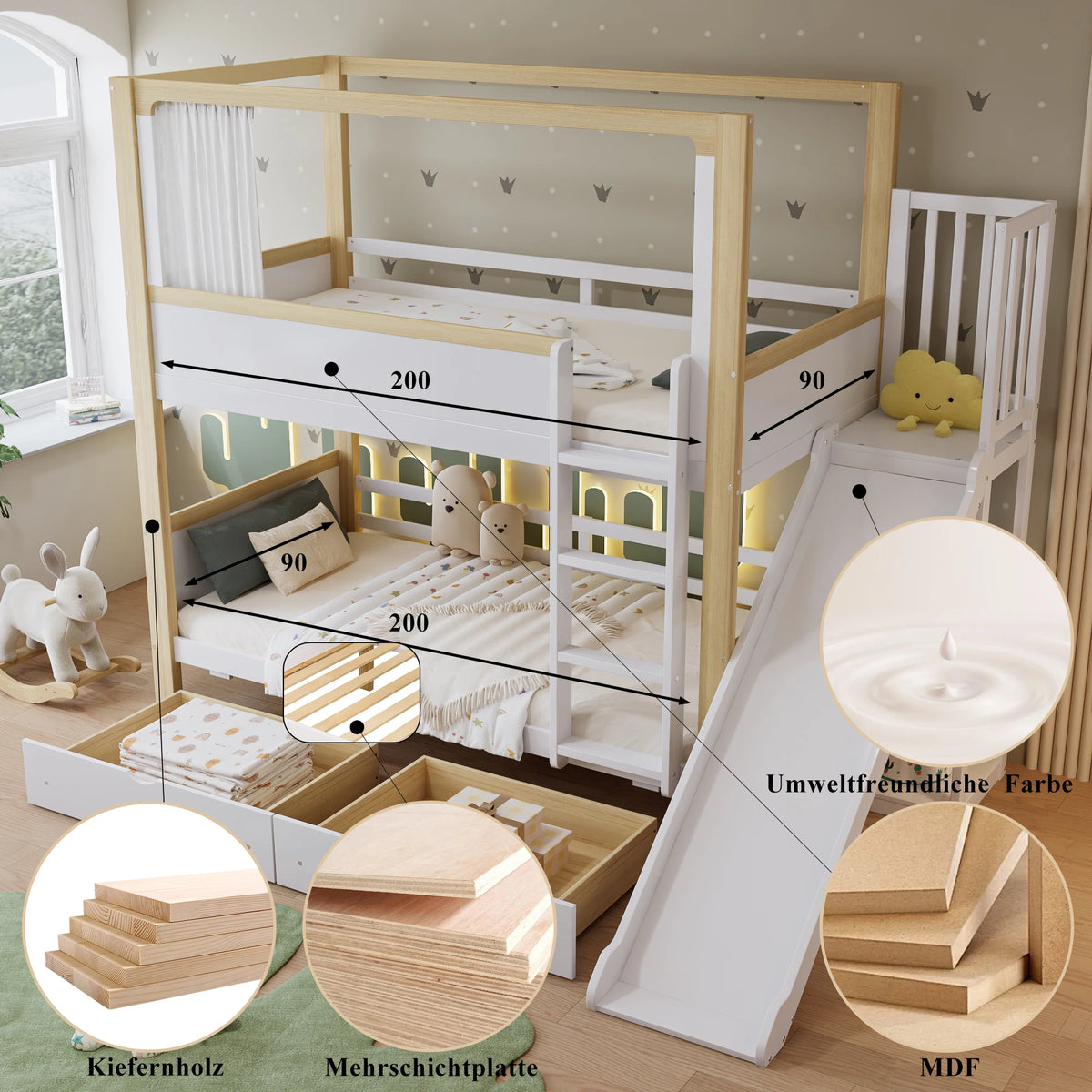 Krevet na kat za djecu s toboganom 90x200cm Dva ladice Zavesa
