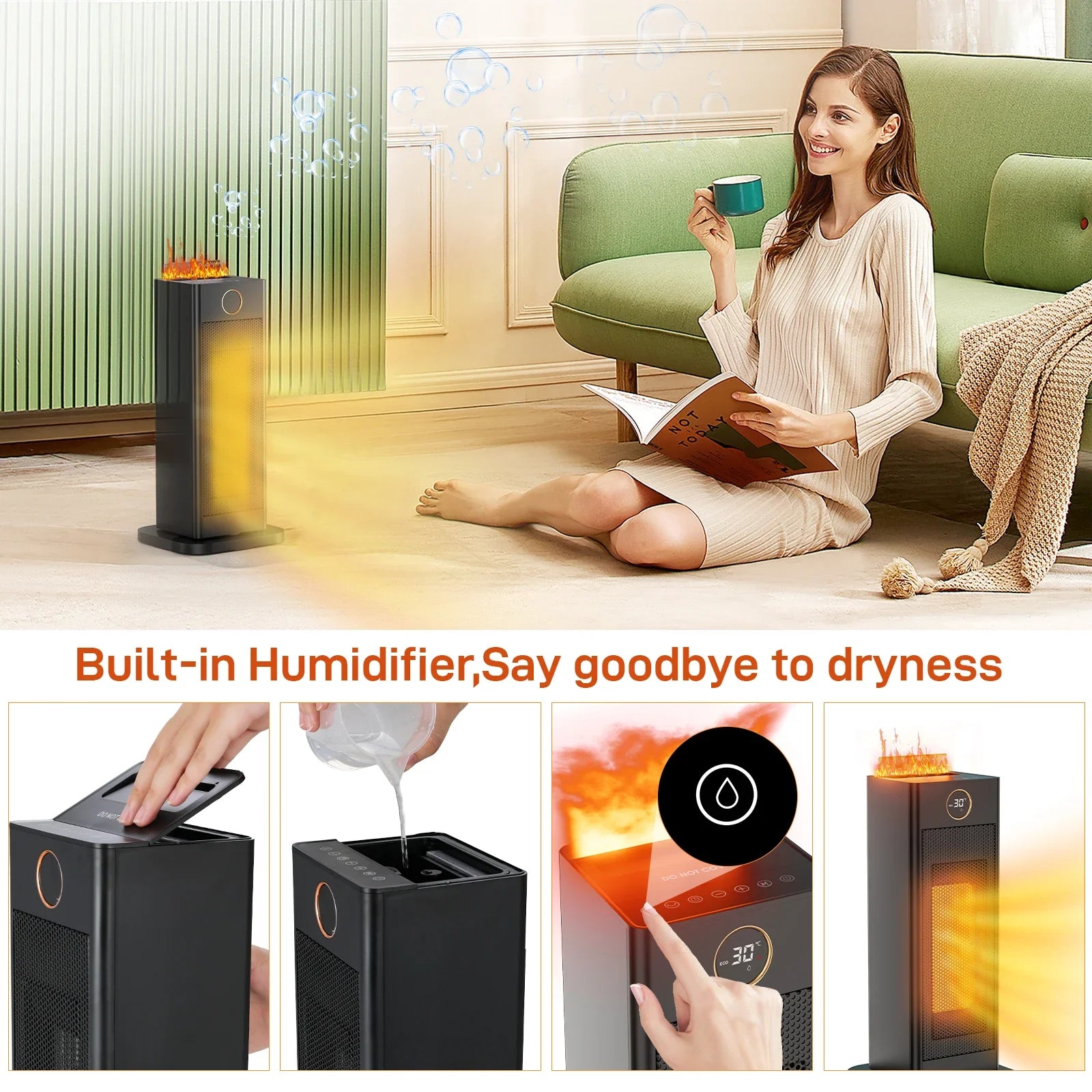 Opremljen s 90° oscilacijom, LED zaslonom i kompaktnim dimenzijama (17 x 11 x 41/28.5 cm) s napojnim kabelom od 1,5 m, ovaj grijač pruža brzu toplinu bez nereda. Funkcija ovlaživača podržava ugodnu vlažnost zraka, što ga čini idealnim za suhe zime u spavaćim sobama i dnevnim boravcima. Sigurnost je ugrađena s zaštitom od prevrtanja na 65° i zaštitom od pregrijavanja, pružajući vam mir dok grijete svoj prostor.