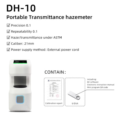 - DH-10: Instrument, Glava za punjenje, USB kabel / Kabel za punjenje, U Disk (QC softver, priručnik), 1 test otvor, 2 test otvora, 3 test otvora, Kvalificirani certifikat, Jamstvena kartica, Popis pakiranja, Certifikat o kalibraciji, Crna torba za nošenje