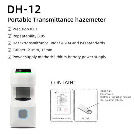 - DH-12: Instrument, Glava za punjenje, USB kabel / Kabel za punjenje, U Disk (QC softver, priručnik), 1 test otvor, 2 test otvora, 3 test otvora, Kvalificirani certifikat, Jamstvena kartica, Popis pakiranja, Certifikat o kalibraciji