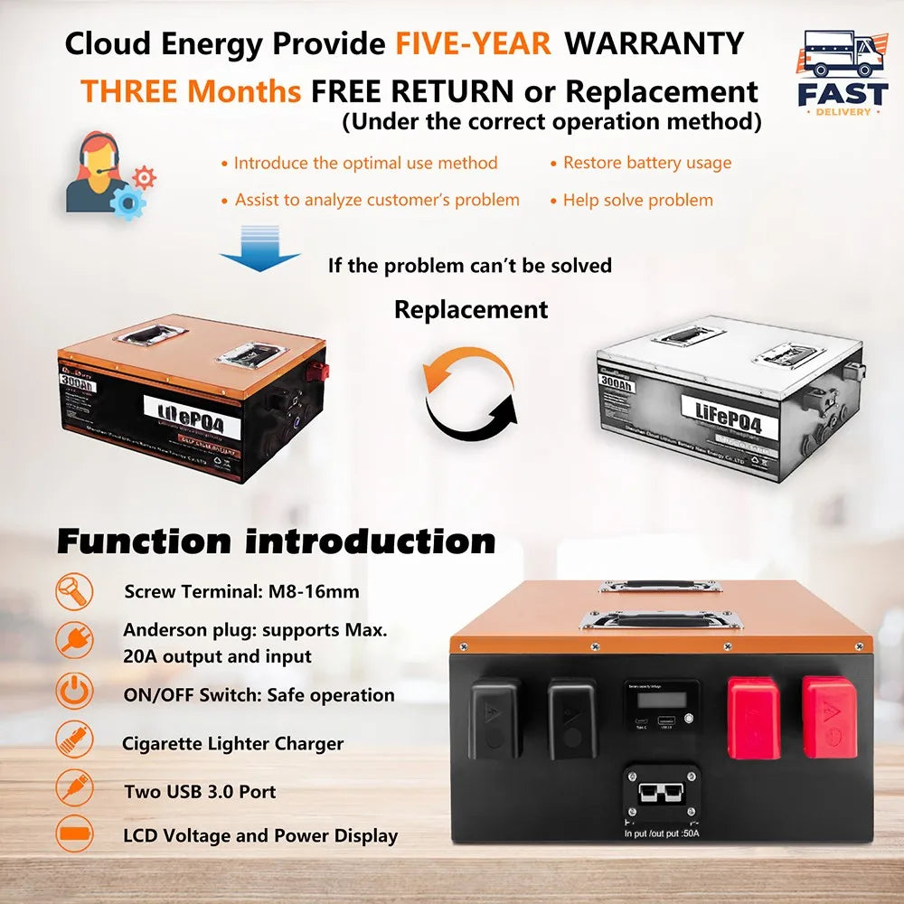 Upoznajte Cloudenergy 12V 300Ah LiFePO4 baterijski paket — robusni izvor energije automobilske klase dizajniran za život izvan mreže, avanture s RV-om, pomorsku upotrebu i pouzdanu kućnu rezervu. Izrađen s ćelijama LiFePO4 visoke gustoće energije i izdržljivim SPCC čeličnim kućištem, ova baterija isporučuje stabilnu, čistu energiju s produženim, bez održavanjem performansama. S impresivnih 3840Wh energije i 10-godišnjim vijekom trajanja, napaja vaše sustave duže na oblačnim danima i može se reciklirati za održivu upotrebu energije. Integrirani BMS štiti od prepunjenja, prepražnjenja, prekomjerne struje i kratkog spoja, pružajući vam mir za svakodnevno punjenje i produžene upotrebe. Sva elektronička i mehanička oprema, uređaji i strojevi koje prodaje InterCyprus zemljama EU su CE certificirani i imaju dvogodišnje jamstvo.