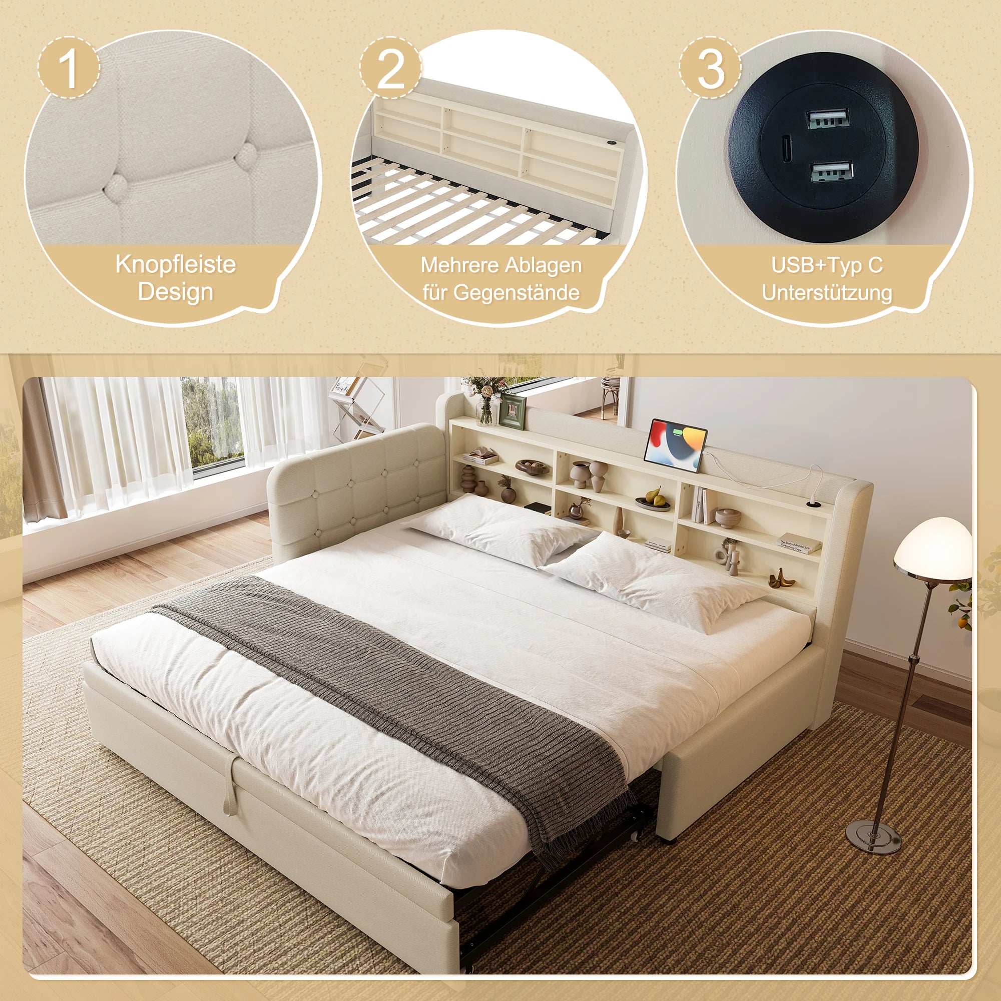 Krevet za dan 90x200 s izvlačnim dizajnom i USB C priključcima za pohranu