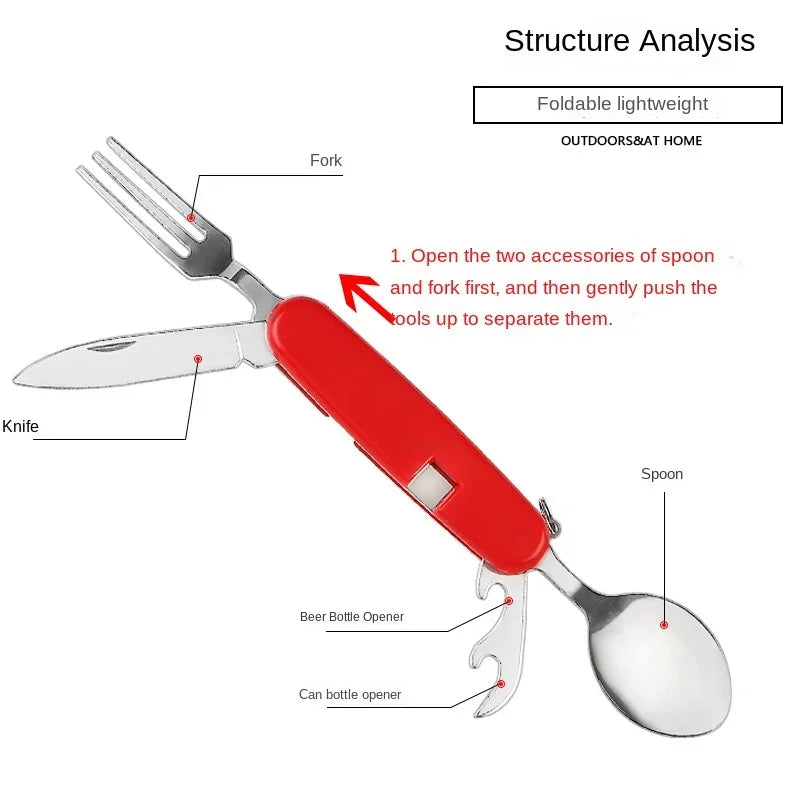 Pojednostavite svoje vanjsko objedovanje s ovim svestranim kamperskim setom pribora. Izrađen od izdržljivog nehrđajućeg čelika, ovaj kompaktni alat omogućuje vam da lako žlicom, režete i nabijate svoje obroke. Savršen za planinarenje, pješačenje ili ribolov, ovaj set pribora je neophodan za svakog ljubitelja prirode. Nabavite svoj sada i uživajte u praktičnom objedovanju na svim svojim avanturama!