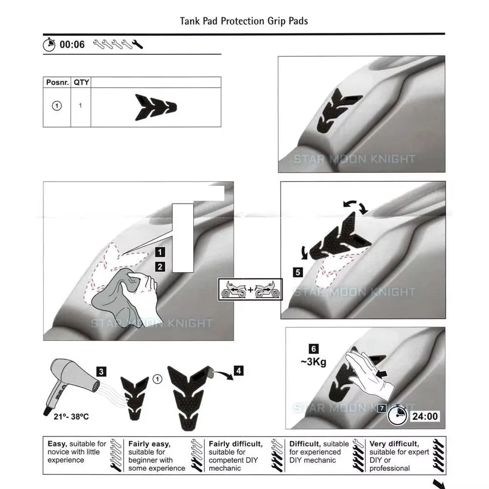 - Prijateljski savjet za instalaciju: temeljito očistite površinu rezervoara, čvrsto pritisnite podloge na mjesto i ostavite 24 sata da se ljepilo stvrdne prije prve vožnje.
