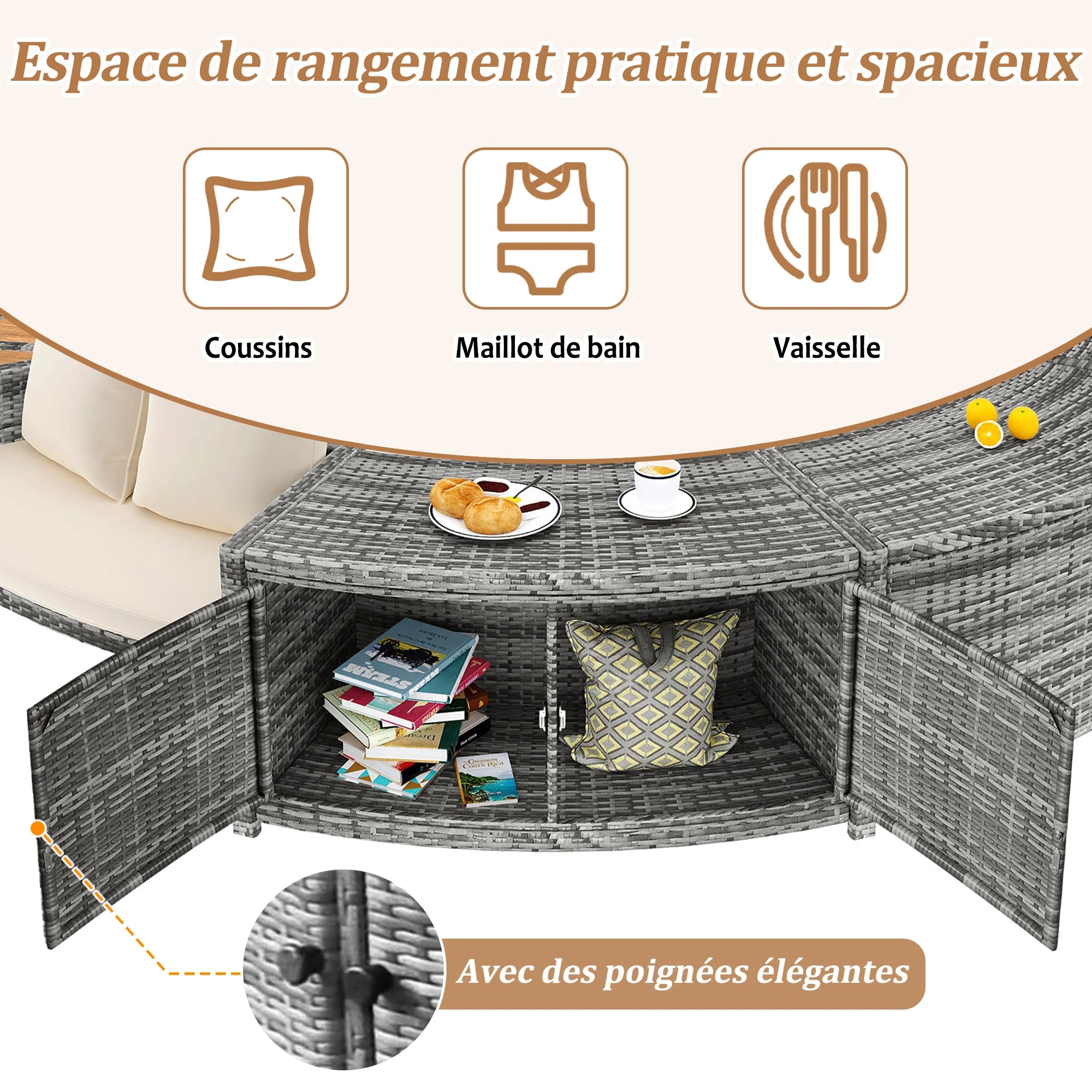 Pametna pohrana i udobnost dolaze zajedno u ovoj vrtnoj sofi. Ugrađeni prostor za pohranu s dva vrata drži ručnike, kremu za sunčanje i druge potrepštine uredno pohranjene, tako da se možete opustiti bez nereda. Paket uključuje dva jastučića i jastučić za dvostruko sjedenje kako bi svima bilo udobno dok sunce sja. PE-ratan završna obrada dodaje elegantan dodir koji upotpunjuje svaku vrtu dekoraciju.
