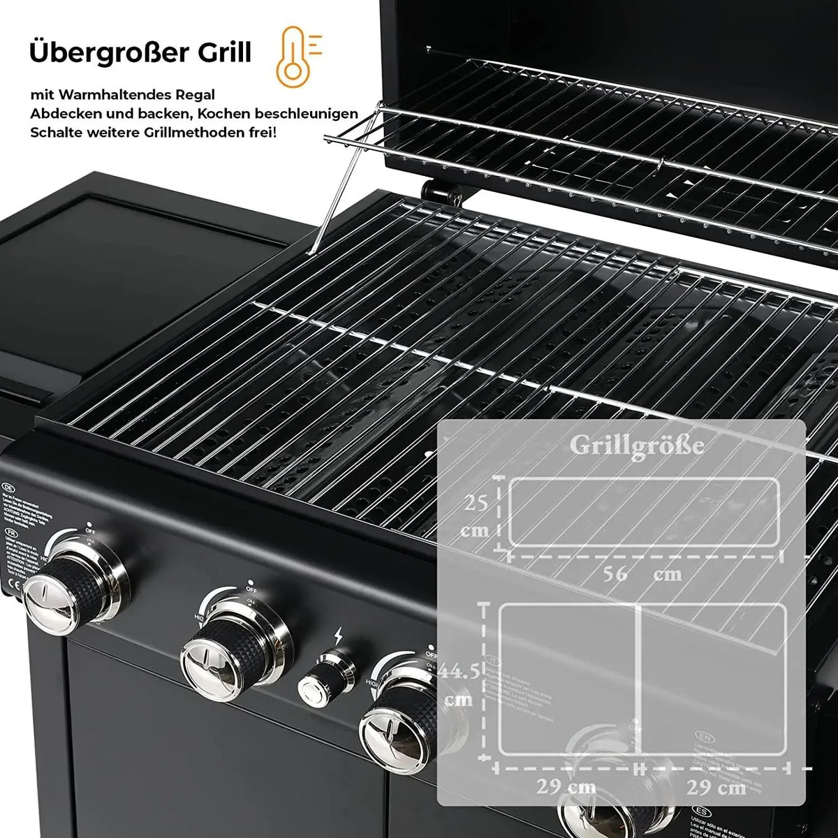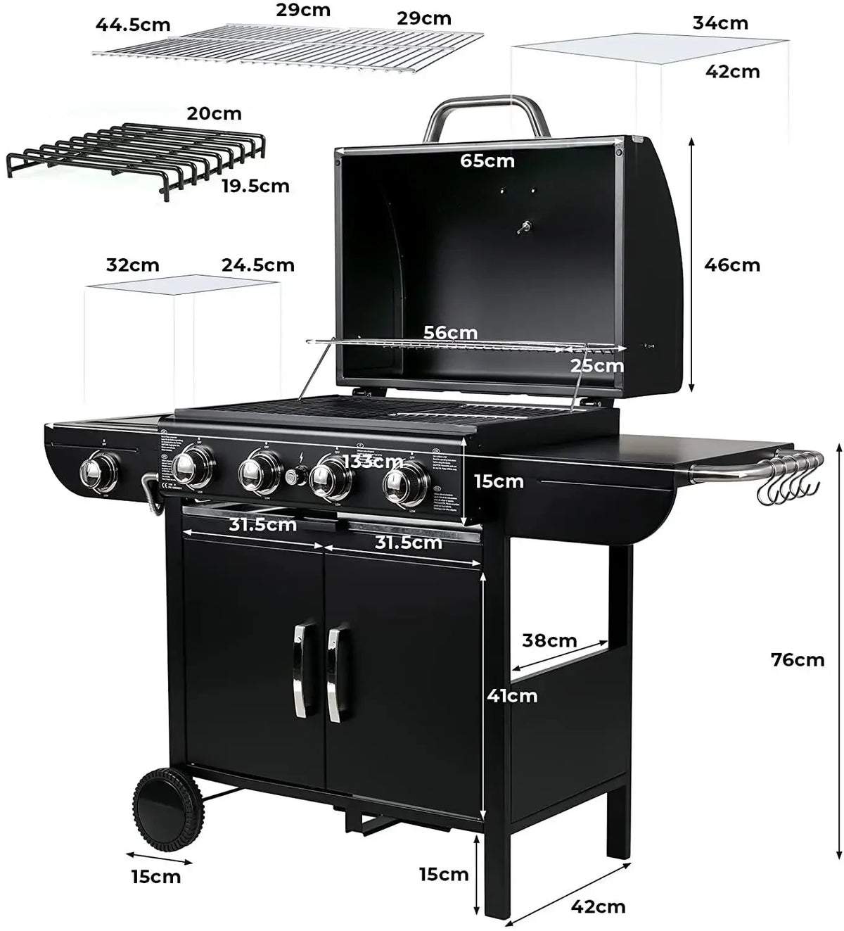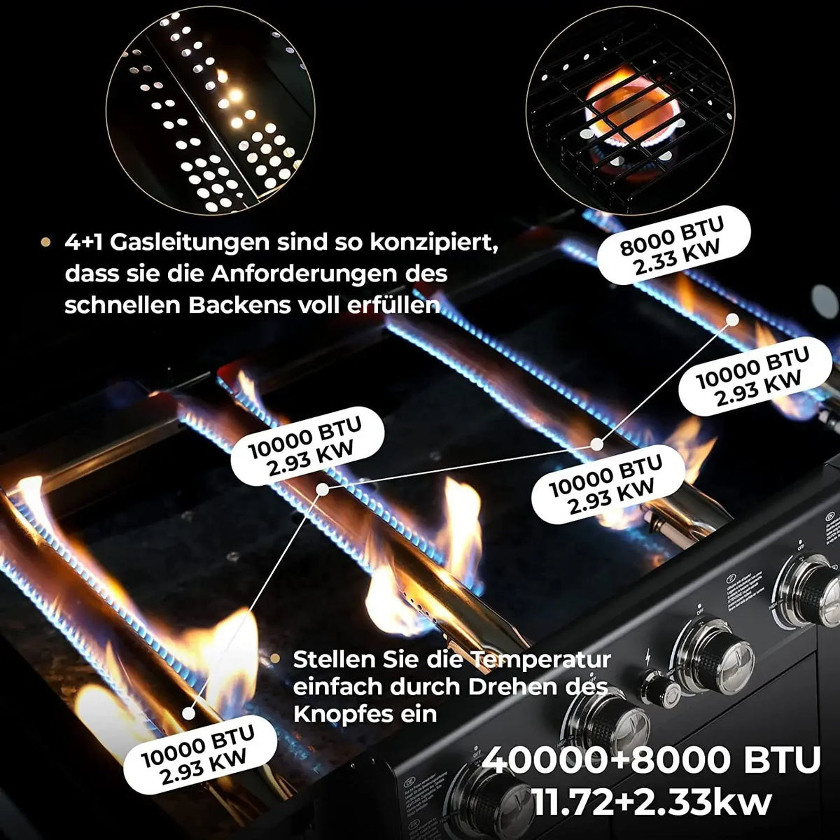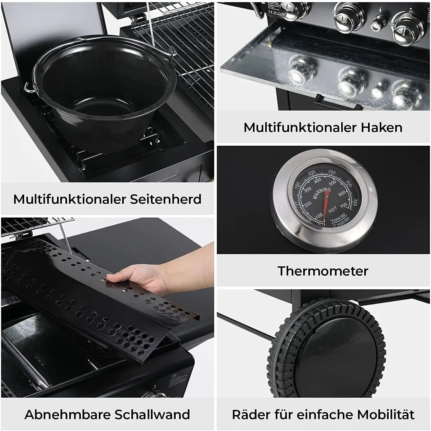 Upoznajte plinski roštilj s kolica s piezo paljenjem i stalak za termometar — snažna vanjska roštiljna stanica koja kombinira četiri glavna plamenika i bočni plamenik u čvrstom čeličnom kolica, dizajnirana za korištenje s prirodnim plinom i idealna za balkone, terase ili postavke na plaži. Ovaj prijenosni roštilj s postoljem omogućuje preciznu kontrolu temperature i brzo paljenje bez napora, tako da možete peći, roštiljati i poslužiti s povjerenjem.