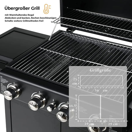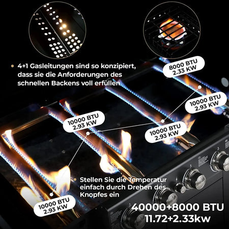 - Jednostavno paljenje i precizna kontrola temperature: četiri glavna plamenika plus bočni plamenik mogu se paliti i podešavati pojedinačno za svestrano kuhanje.