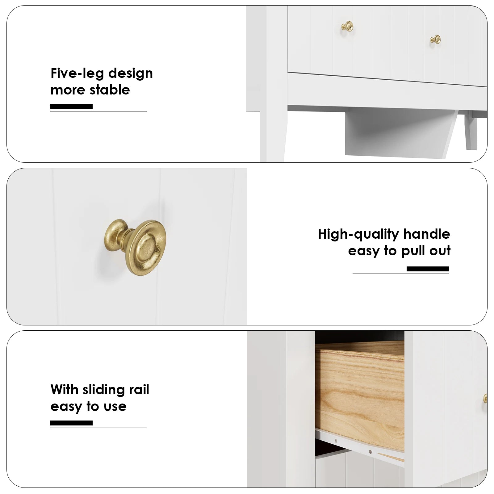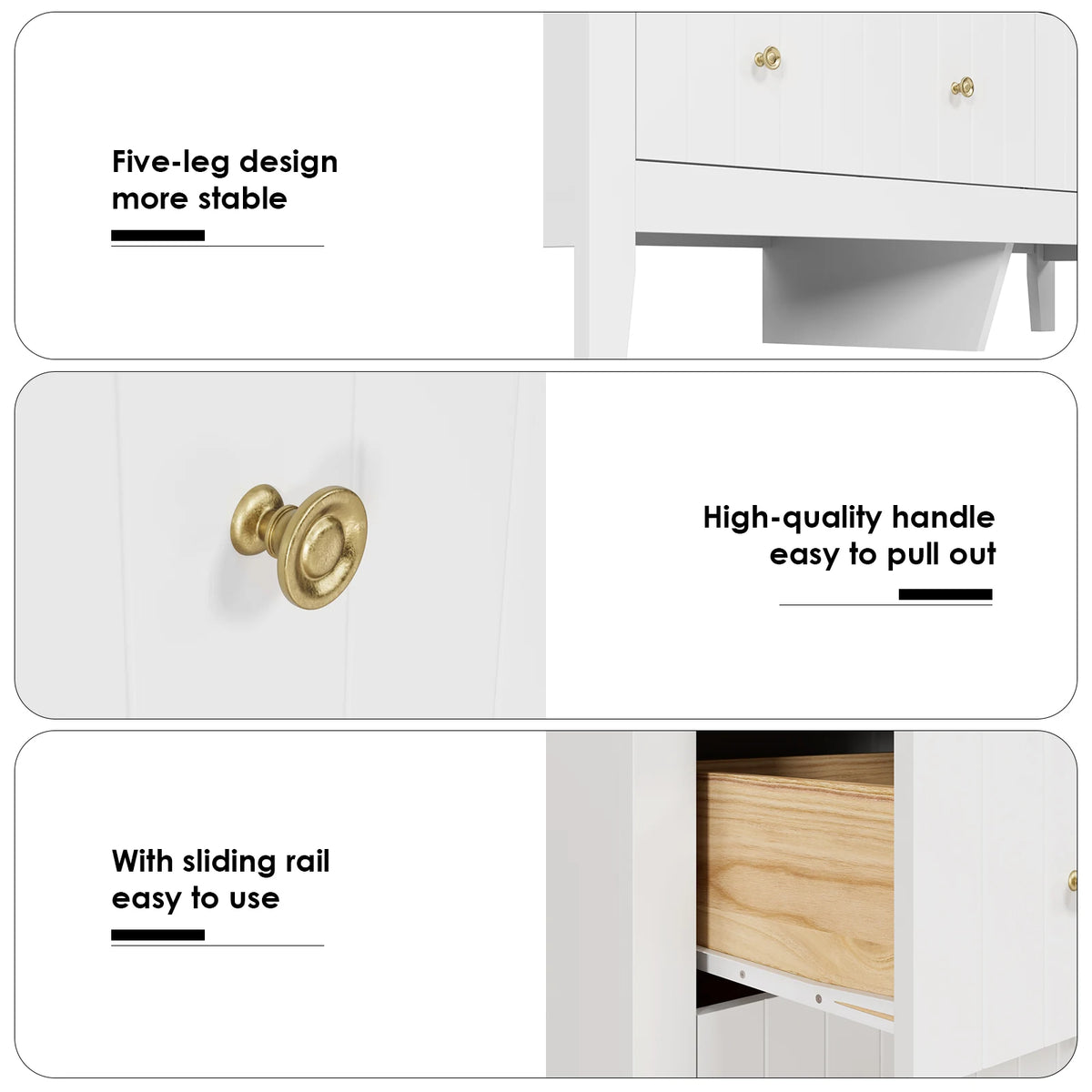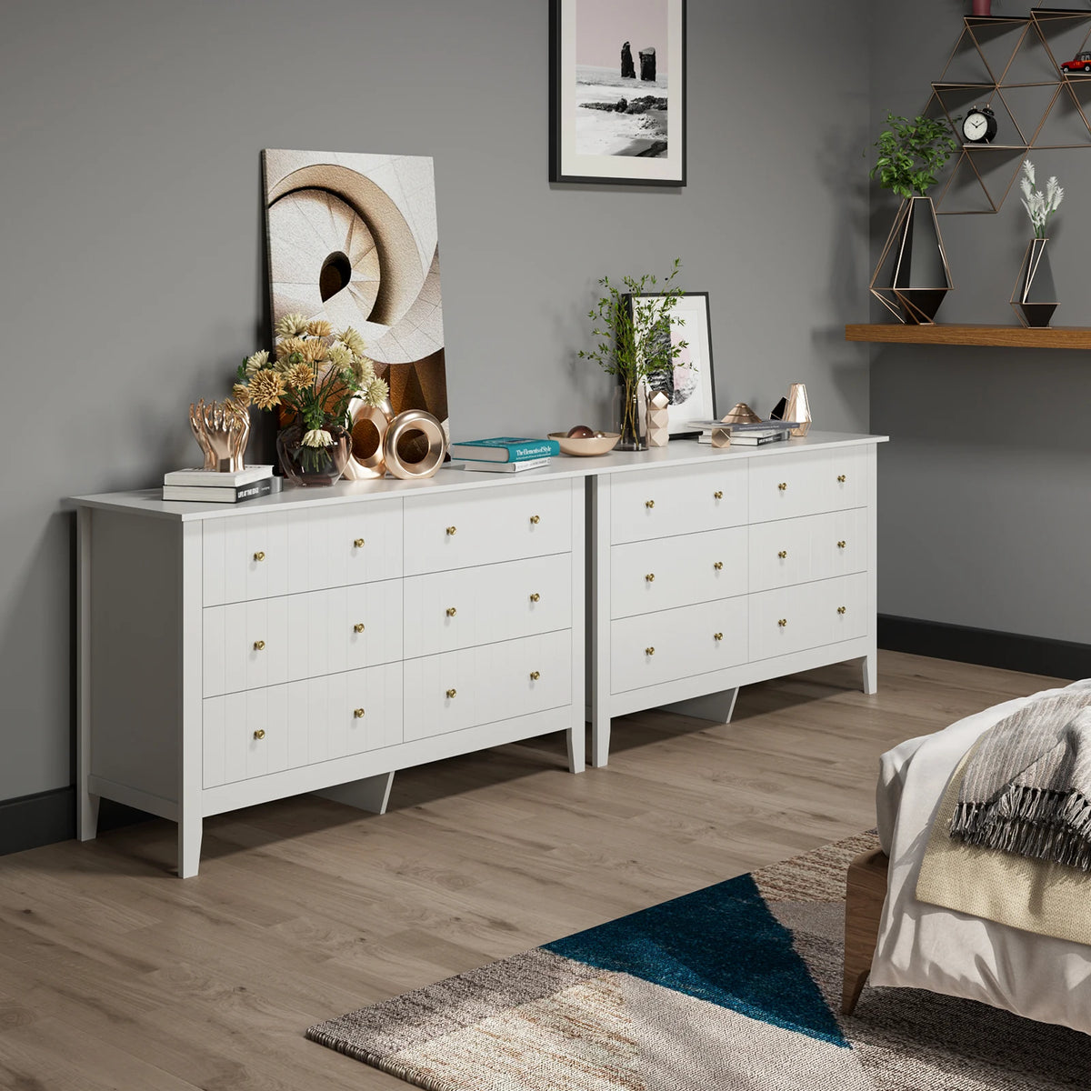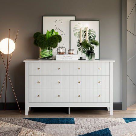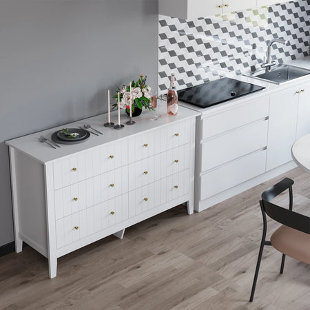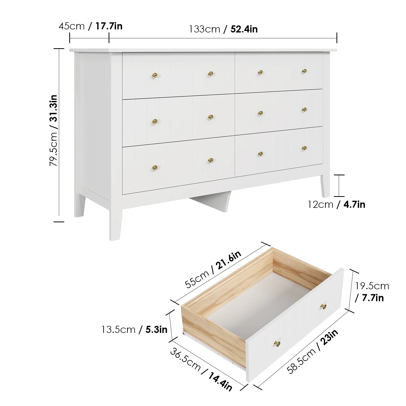 Getone visoka komoda s 6 ladica za spavaću sobu donosi svjetlost i red u vaš prostor s modernim minimalističkim dizajnom. Izrađena s bijelim MDF tijelom, bočnim dijelovima od punog drva i bijelim frontama ladica, ova komoda nudi trajnu stabilnost i čist, suvremen izgled. Dimenzije su 133x45x79.5 cm, a sadrži šest ladica jednake veličine koje se kreću na glatkim metalnim vodilicama, pružajući vam dovoljno prostora za odjeću, igračke, posuđe i svakodnevne potrepštine. Bijela završna obrada i jednostavne linije čine je svestranom za spavaće sobe, dnevne boravke, ulaze i blagovaonice.