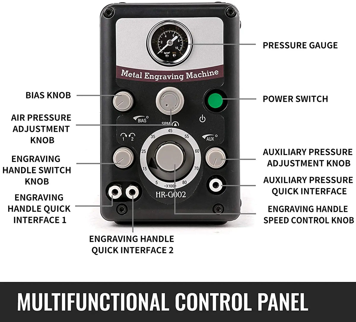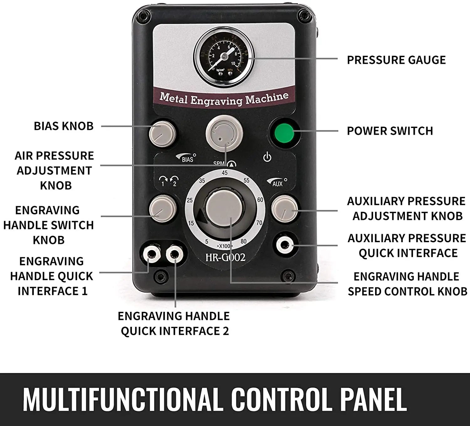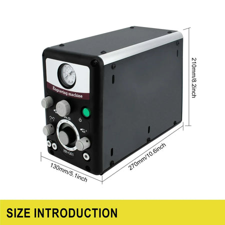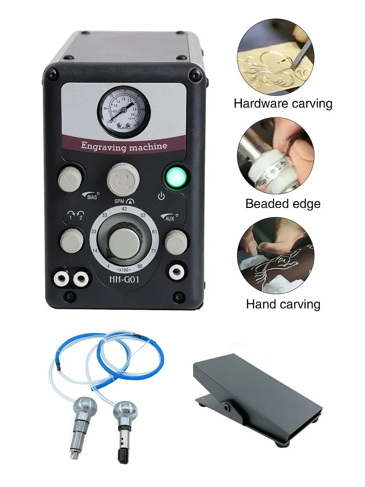 Graver Max G8 Pneumatski alat za graviranje za izradu nakita je robusni sustav graviranja s dva vrha dizajniran za profesionalni rad s nakitom. Ova pneumatska gravirna mašina s dva vrha (Model HH-G01) pruža visoku brzinu, precizno graviranje s širokim rasponom brzina od 0–8000 udaraca u minuti. Njegove dvije zamjenjive ručne glave, u kombinaciji s svestranim zračnim sustavom, omogućuju vam da se s povjerenjem nosite s delikatnim natpisima, mikro-postavkama i složenim rezbarijama. Ergonomičan dizajn uključuje podešavanje prednjeg zračnog tlaka, brze spojnice za zrak, spojnicu za plin montiranu straga i tiho, bez vibracija, jedinicu za puls ventila za udobne duge sesije. Mašina podržava dvije udarne ručne glave i pomoćnu zračnu vezu za druge alate, uključujući rotacijsku ručnu glavu, što je čini fleksibilnim dodatkom svakoj radionici za nakit. U kompletu s dvije ručne glave i kontrolom nogom, spremna je pomoći vam da unaprijedite svoje majstorstvo od prvog dana. Za rad, osigurajte da vaš zračni kompresor isporučuje 0,15 MPa–0,25 MPa za dosljedne performanse. Idealna za obradu nakita, rezbarenje, graviranje, mikro-postavljanje i srodne zadatke. Sva elektronička i mehanička oprema, uređaji i mašine koje prodaje InterCyprus zemljama EU su CE certificirani i imaju dvogodišnje jamstvo. Na intercyprus.com od 2002. — pouzdano za kvalitetu i pouzdanost.