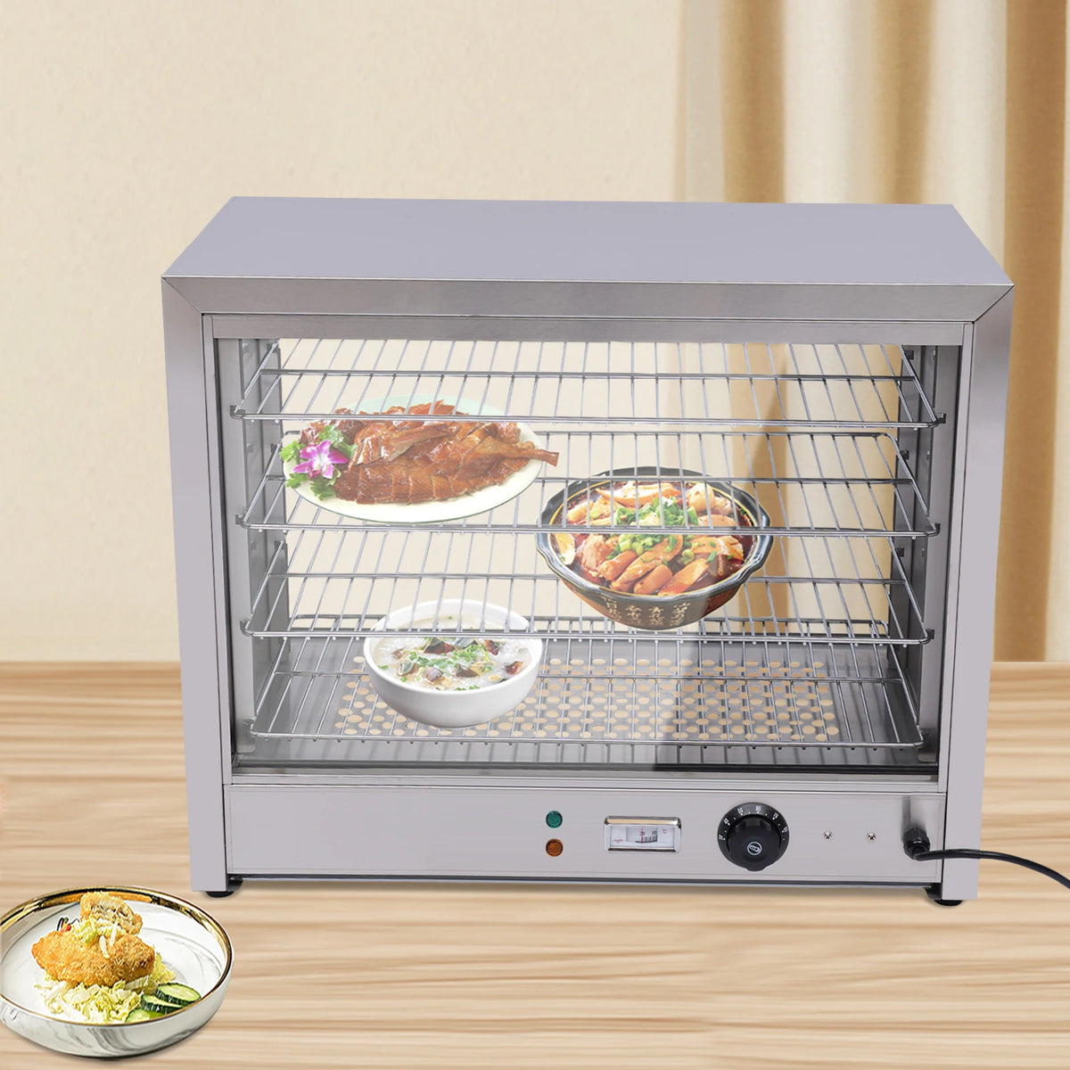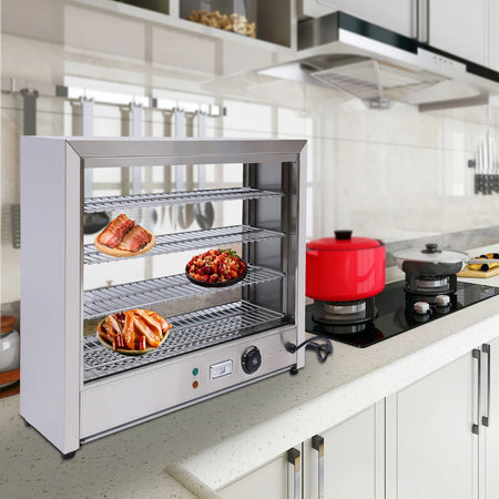 Otkrijte ultimativno rješenje za održavanje vaše hrane toplom i spremnom za posluživanje s našim 4-slojnim ormarićem za grijanje hrane s podesivim policama od izdržljivog nehrđajućeg čelika. Ova moderna, samostojeća jedinica dizajnirana je za održavanje optimalnih temperatura između 30°C i 85°C, osiguravajući da vaše pizze, hamburgere i druge vruće namirnice ostanu svježe i ukusne bez isušivanja. Izrađena od visokokvalitetnog 201 nehrđajućeg čelika i kaljenog stakla, otporna je na koroziju i hrđu dok pruža jasan pregled vašeg sadržaja. Recite zbogom hladnim obrocima na događanjima ili u zauzetim kuhinjama—ovaj grijač rješava uobičajene probleme poput neujednačenog grijanja i ograničenog prostora za pohranu nudeći podesive police i ravnomjernu distribuciju topline, čineći ga savršenim za komercijalno catering ili kućnu upotrebu.