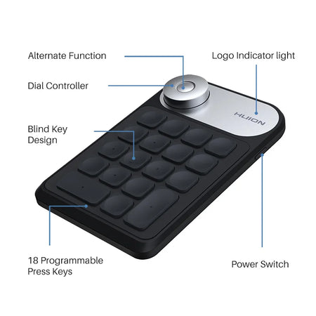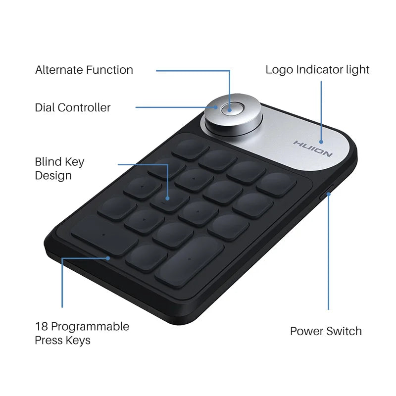 Upoznajte HUION Keydial obitelj — kompaktna, ergonomska bežična tipkovnica dizajnirana za ubrzanje vašeg kreativnog tijeka rada. S Bluetooth 5.0 i USB-C povezivanjem, pruža pouzdanu, bežičnu kontrolu za grafičke tablete, stolna i prijenosna računala. Ovaj model dolazi u dvije snažne varijante: Keydial Mini (K20) s 18 programabilnih tipki plus kotačić, i Keydial Remote (K40) s kontrolerom s dva kotačića i osam programabilnih tipki. Oba su dizajnirana za korištenje lijevom ili desnom rukom i rade s Huion grafičkim tabletima, olovnim ekranima, olovnim računalima i mnogim drugim markama, čineći ih svestranim suputnikom za crtanje, video montažu, 3D modeliranje i još mnogo toga.