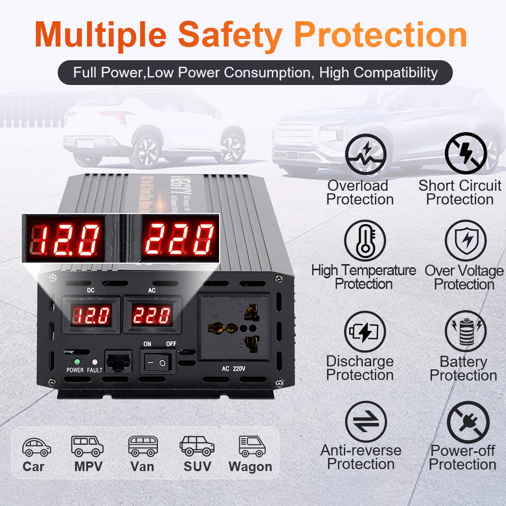 Inverter isporučuje izlaz s čistim sinusnim valom, osiguravajući glatko djelovanje za zahtjevnu elektroniku i izbjegavajući buku i nestabilnost konvertera s kvadratnim valom. Podržava ulaz u rasponu od 10–15V DC i isporučuje 220V AC na 50Hz, održavajući napon unutar ±10% za pouzdanu izvedbu gdje god se nalazili. Dostupne su tri varijante za različite opterećenja: