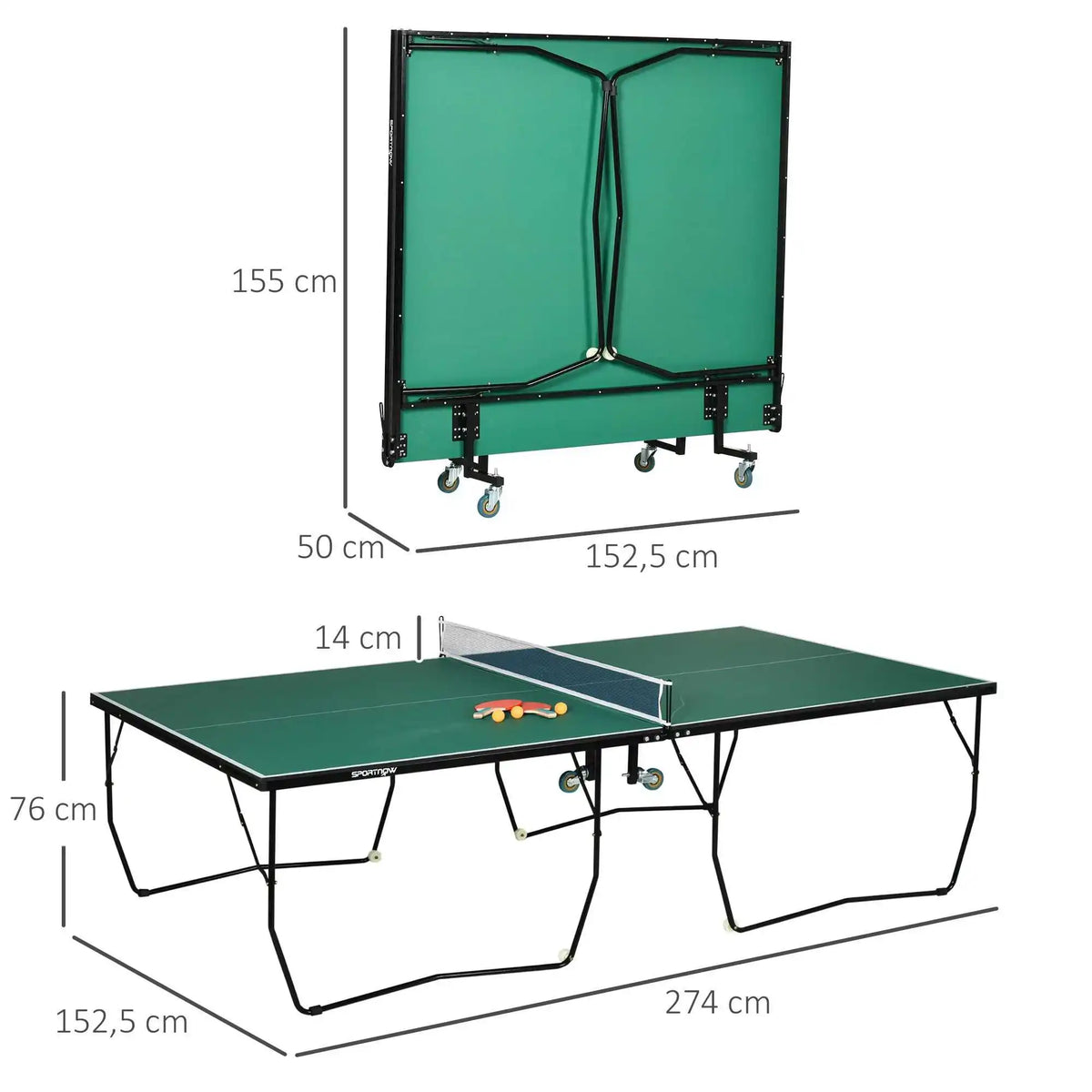 Iskusite brzu zabavu s Preklopnim Unutarnjim Stolom za Ping Pong na Kotačima — svestran dodatak za svaki dom, učionicu ili uredsku igraonicu. Dimenzija 274 cm dužine, 152,5 cm širine i 76 cm visine, nudi pravo iskustvo stonog tenisa za profesionalne igrače i povremene igrače. Robustan čelični okvir s prahom pruža stabilnost i izdržljivost za intenzivne razmjene, dok osam kotača s lakoćom omogućava pomicanje stola po vašem prostoru.