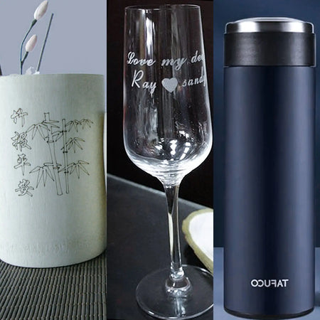 - Gravirajte okrugle objekte poput šalica, boca, olovaka i drugih cilindričnih predmeta s dosljednom dubinom i simetrijom.