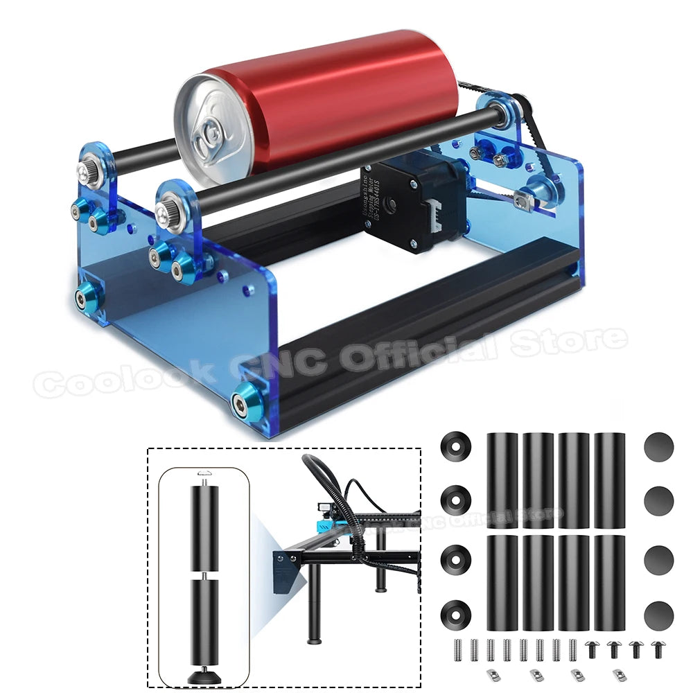 360 Stepeni Y Osni Rotacijski Gravirni Valjak od COOLOOK-a je čvrsti aluminijski rotacijski modul koji se pričvršćuje na širok spektar laserskih gravirača, otključavajući precizno graviranje na zakrivljenim površinama. Dizajniran za izdržljivost i dosljedne performanse, ovaj rotacijski valjak vam omogućava da pređete izvan ravnog graviranja i lako se nosite s cilindričnim objektima.