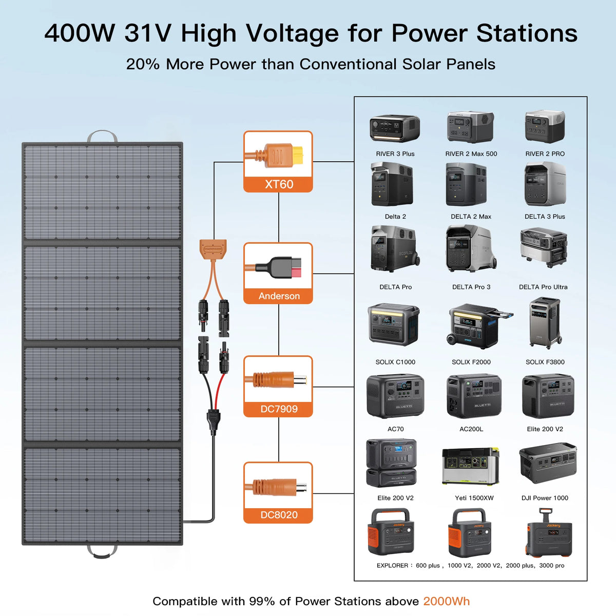 - Maksimizirajte sunčane dane s do 400W vršne snage i ~23.5% učinkovitosti pretvorbe za brže punjenje tijekom aktivnosti na otvorenom ili u hitnim situacijama.