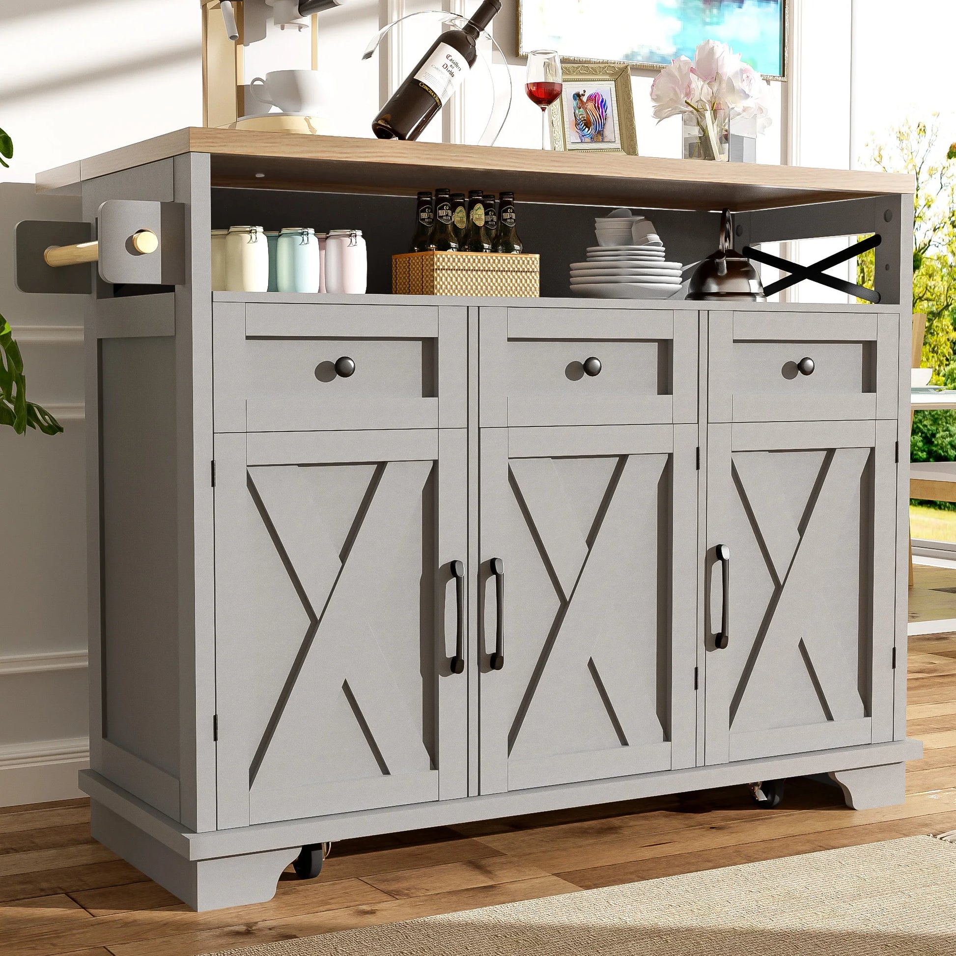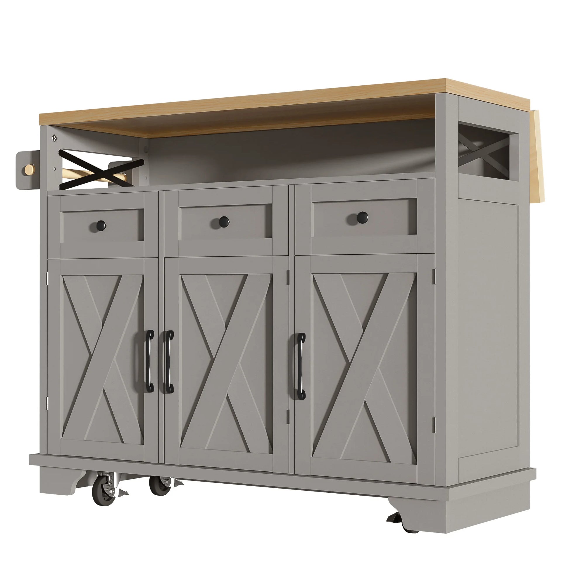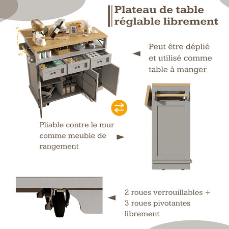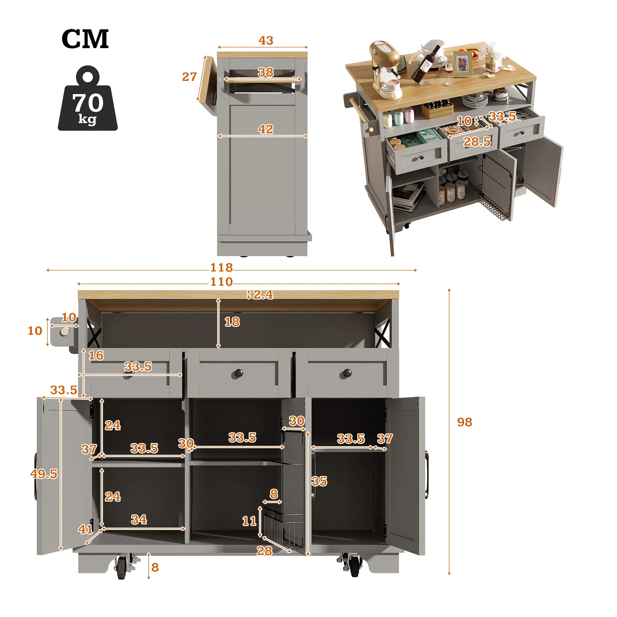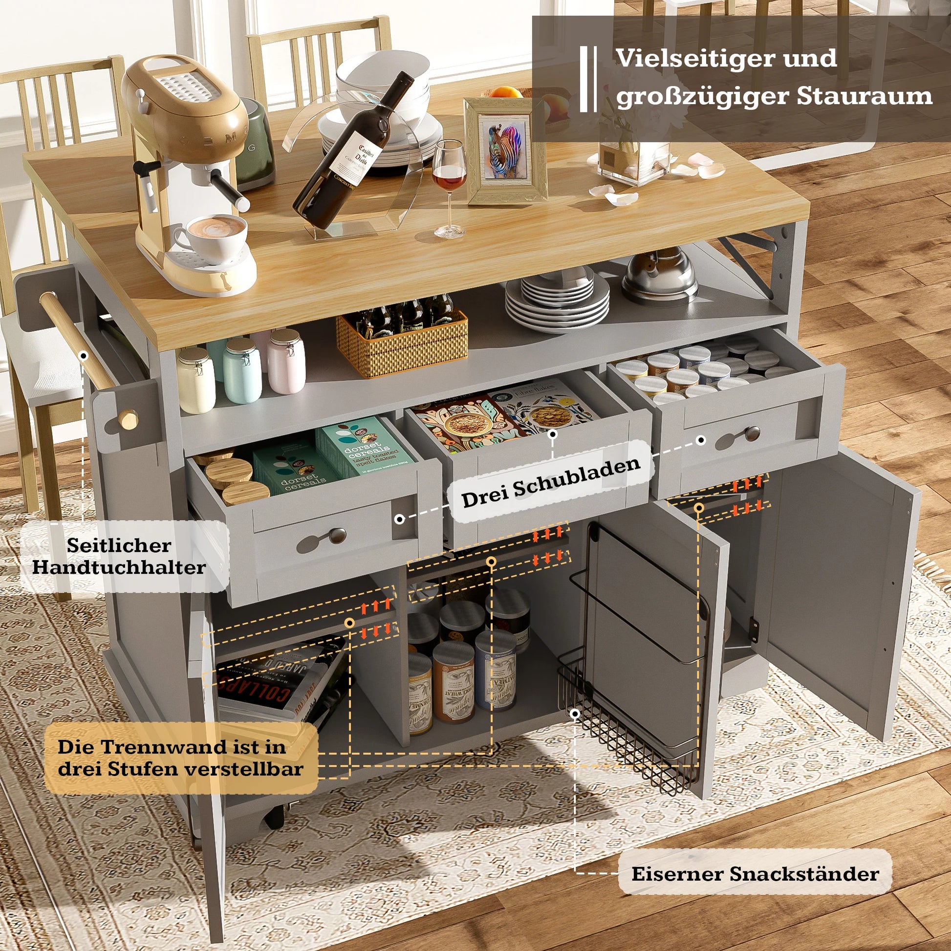 Unaprijedite svoju kuhinju s Modernim Kuhinjskim Otokom S Preklopnim Panele I Drvenom Strukturom. Ova svestrana kuhinjska kolica kombiniraju čvrstu drvenu površinu s praktičnom pohranom i mobilnošću, dizajnirana da odgovara kako užurbanim profesionalnim kuhinjama, tako i udobnim kućnim prostorima. Preklopni bočni paneli se protežu do 80 cm, pretvarajući otok u prostranu površinu za objedovanje kada vam je potrebna dodatna sjedeća mjesta ili veći prostor za pripremu. Kada je prostor ograničen, jednostavno preklopite panele natrag u kompaktni oblik za svakodnevnu upotrebu. Gusti drveni panel pruža izdržljiv radni prostor za sjeckanje, rezanje i pripremu obroka, dok ergonomično dizajnirana ručka ladice od cinkove legure osigurava glatko djelovanje. Ukusni dizajn vrata, drveni držač ručnika od hrasta i X-oblikovani željezni ukras dodaju stil i stabilnost, čineći ovaj otok vizualnim središnjim dijelom, kao i funkcionalnom radnom stanicom. Pametna pohrana uključuje vrata s željeznim držačem grickalica i bočnim držačem ručnika, tako da možete držati pribor, začine i ručnike na dohvat ruke. Za fleksibilno kretanje, otok se kreće na kotačima koji se okreću za 360 stupnjeva s dva zaključiva kotača i tri slobodna kotača, omogućujući vam lako navigiranje uskim prostorima ili otvorenim rasporedima.