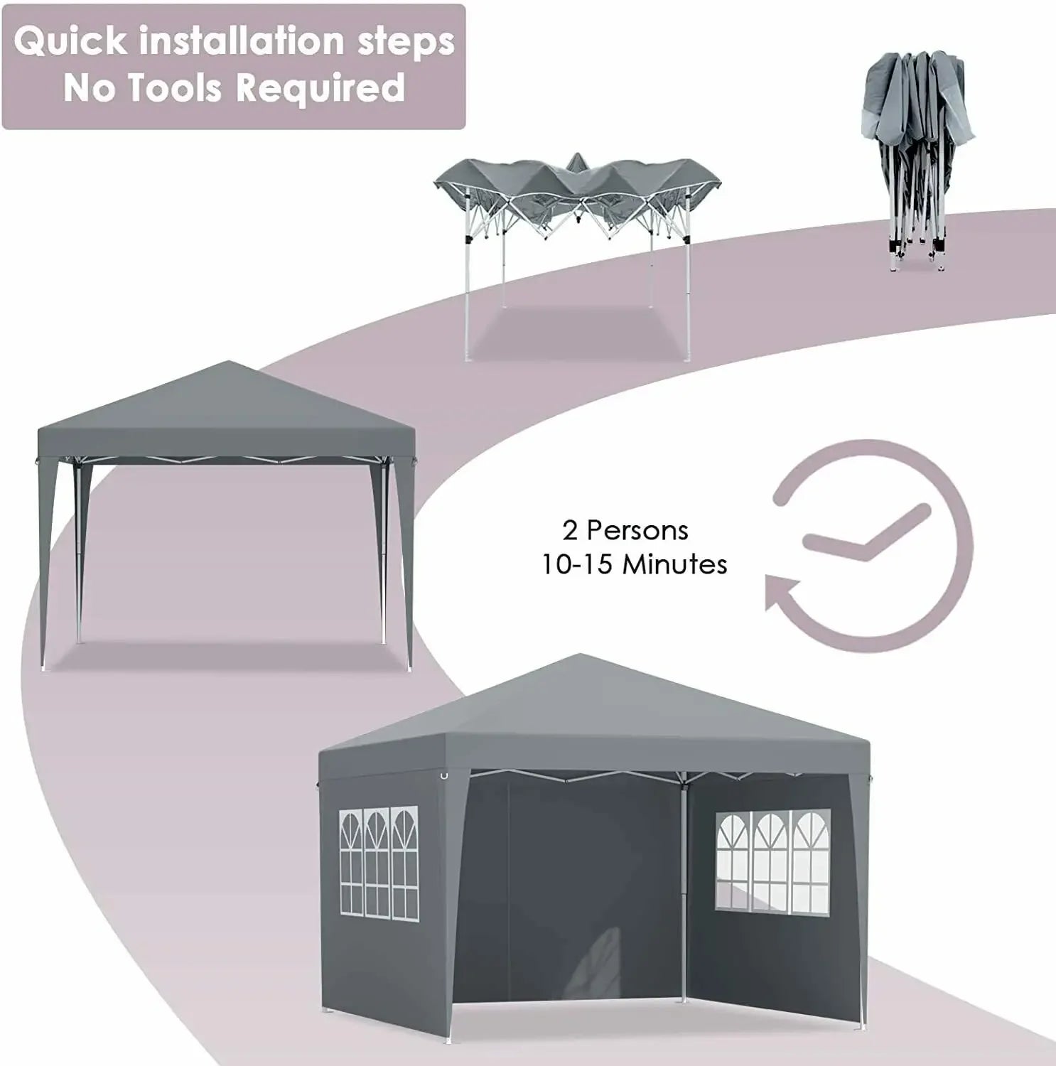 Fleksibilni bočni zidovi za svaku priliku: Gazebo uključuje četiri uklonjiva bočna panela—2 s patentnim zatvaračem i 2 s prozorima—tako da možete prilagoditi protok zraka, privatnost i otvorenost prema vašem događaju. Panele je moguće kombinirati ili ukloniti kako bi se prilagodili od privatne zabave do otvorene izložbe na tržištu u nekoliko minuta.