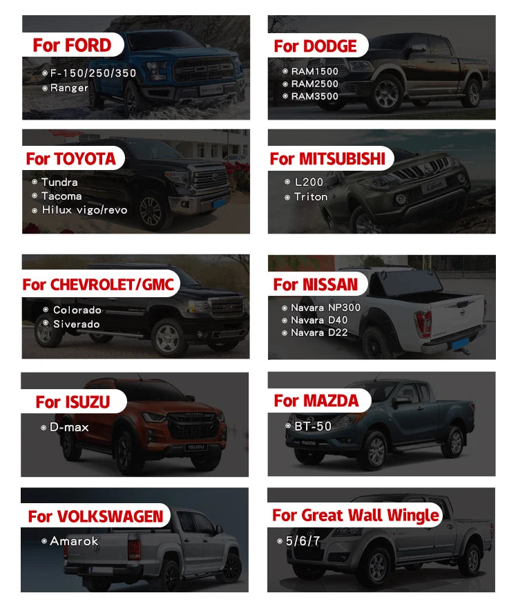 - Model: Ranger, F-150, Sierra 1500, Sierra 2500, Tacoma, HILUX