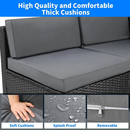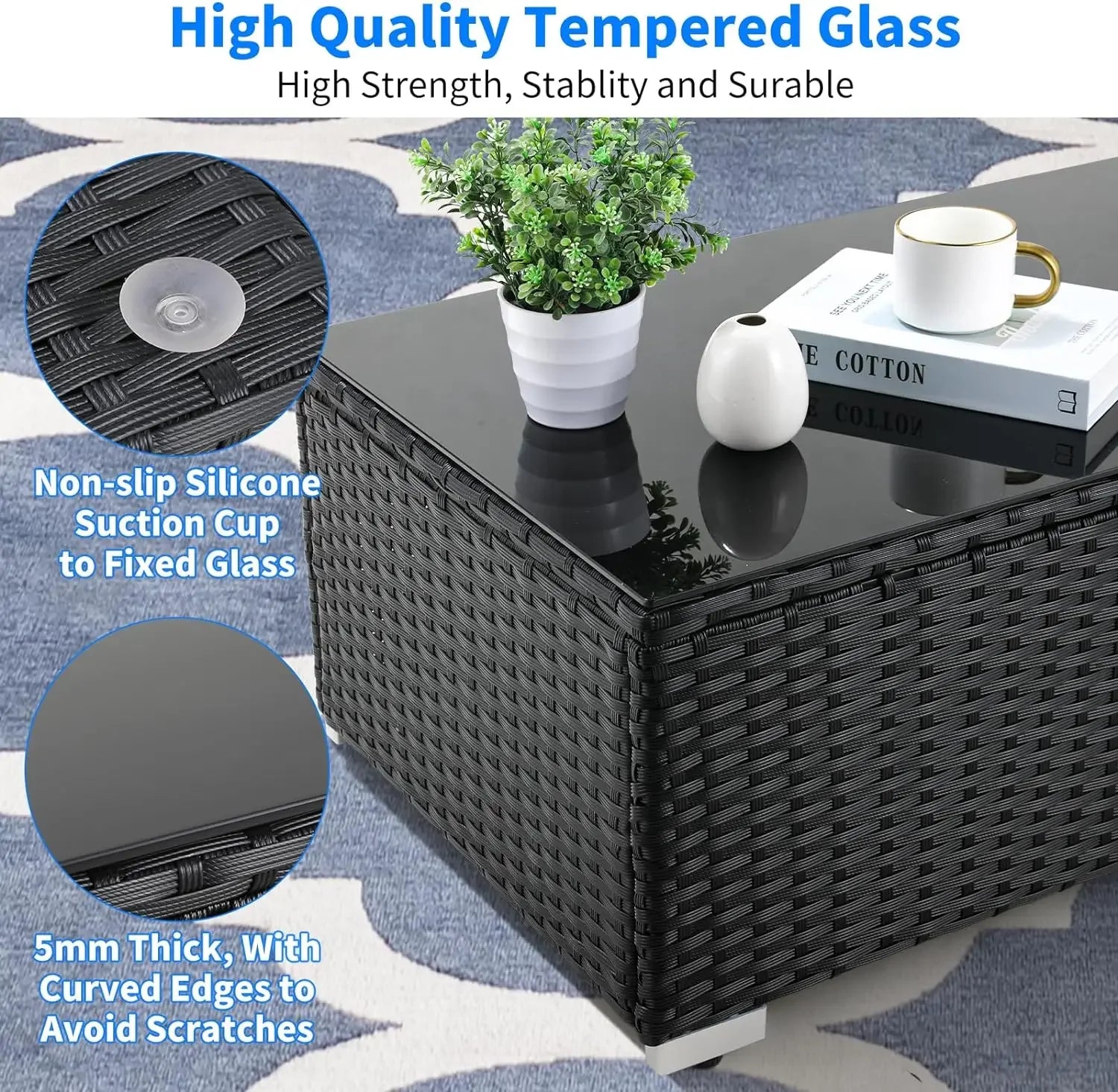 Dizajnirano za vanjski život, okvir otporan na kidanje od poliratana pruža otpornost na vremenske uvjete s UV otpornošću za dugotrajnu boju i oblik. Debeli jastučići za sjedenje od 8,5 cm pružaju udobnost uranjanja, s navlakama za jastučiće od poliesterskih vlakana koje su vodootporne i uklonjive za lako pranje. Čvrsti stolić za kavu ima stakleni vrh debljine 5 mm (69 x 69 cm) za praktične grickalice i pića te jednostavno čišćenje. Moderni, minimalistički dizajn s širokim naslonima za ruke i mekanim jastučićima odgovara raznim stilovima doma i životnim prostorima, od sunčanih terasa do unutarnjih loungea kada je potrebno.