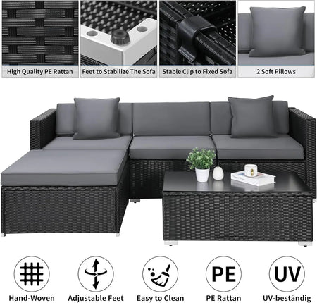 Dizajnirano za fleksibilnu upotrebu, set se može aranžirati prema vašem prostoru i raspoloženju. Idealno je za sunčane poslijepodne uz bazen, opuštanje s prijateljima na terasi ili ugodne večeri u natkrivenoj terasi. Uključeni jastučići pomažu održati namještaj stabilnim na neravnim površinama, a modularni dizajn omogućuje vam da prekonfigurirate kako želite.