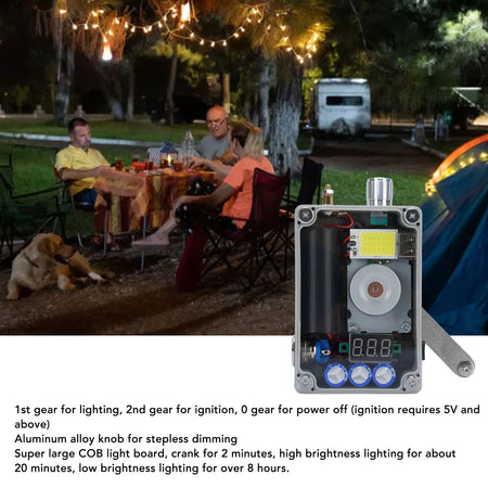 - Hitno osvjetljenje: zavrtite 2 minute da napajate COB svjetlo. Visoka svjetlost traje oko 20 minuta; pri niskoj svjetlosti možete uživati u više od 8 sati osvjetljenja.