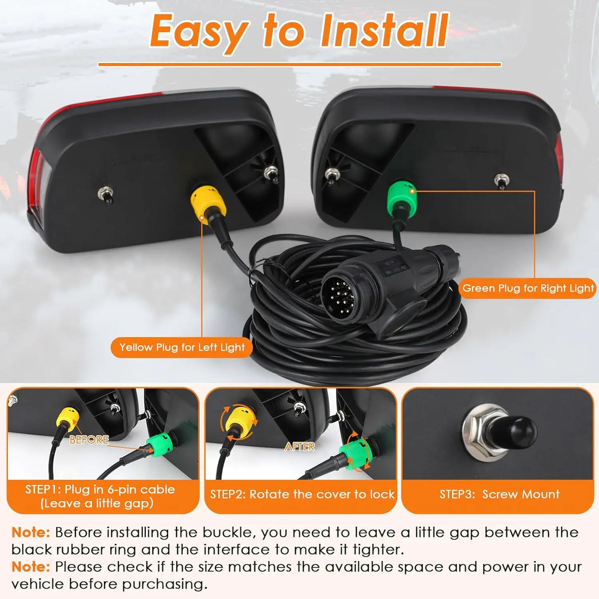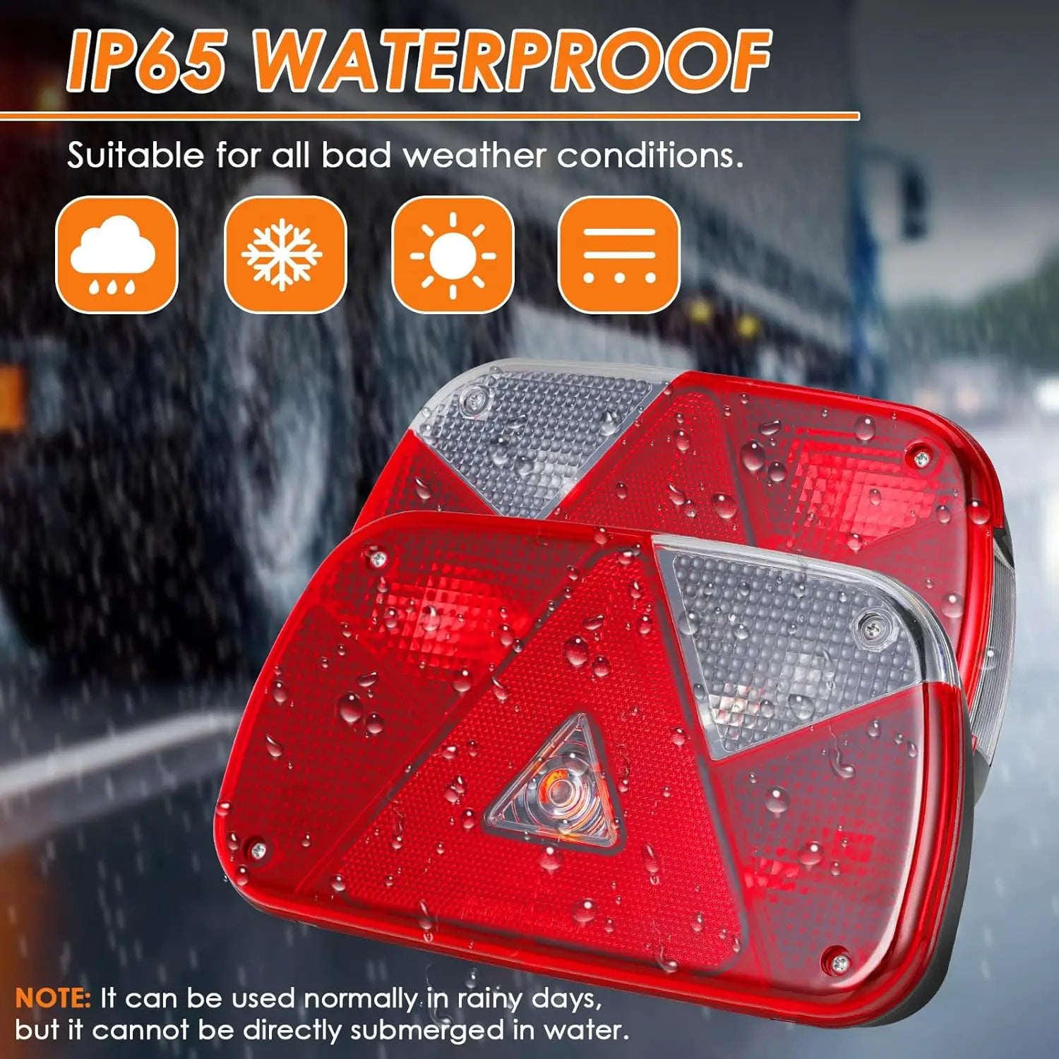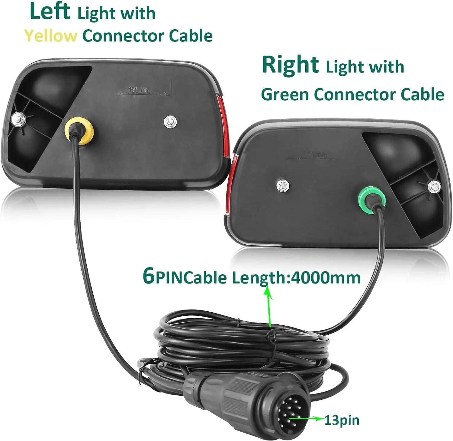 Svaka svjetlost je izrađena s čvrstim ABS kućištem i prozirnom lećom, ocijenjena IP67 vodootpornom za jake kiše, snijeg ili neravne ceste. Set uključuje dva 6-pinska bajonetna konektora i 13-pinsku utičnicu s 5,5-metarskim električnim kabelom, omogućujući brzu, bezbrižnu instalaciju na 12V sustavima. Dimenzije: 238 x 138 x 75 mm po svjetlu; razmak rupa za montažu od centra do centra 150 mm.