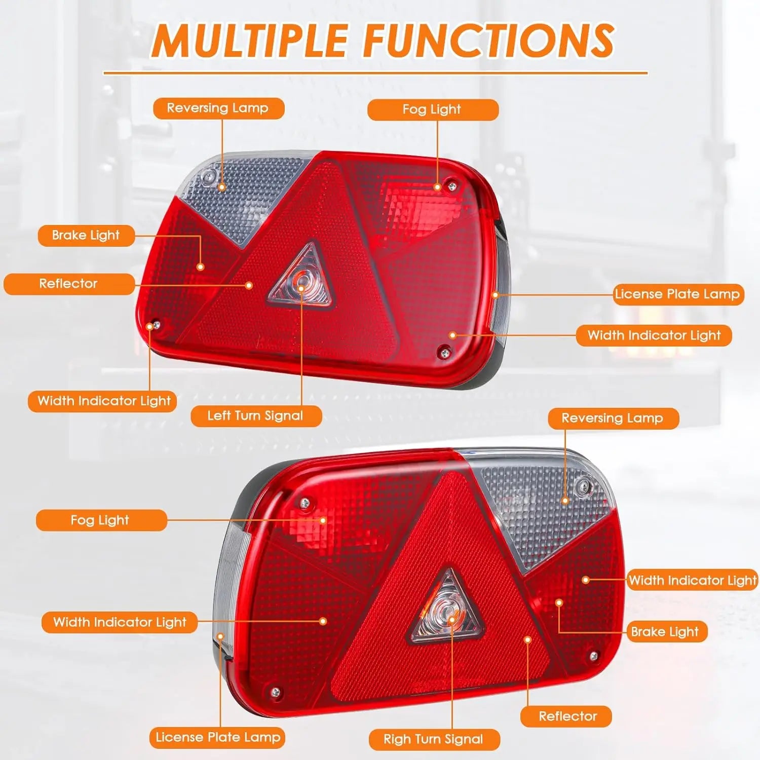 - Funkcije: 7 funkcija (kočnica, pokazivač, stražnje/pozicijsko svjetlo, svjetlo za registarsku oznaku, maglenka, svjetlo za vožnju unatrag, reflektor)