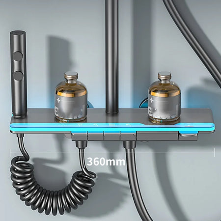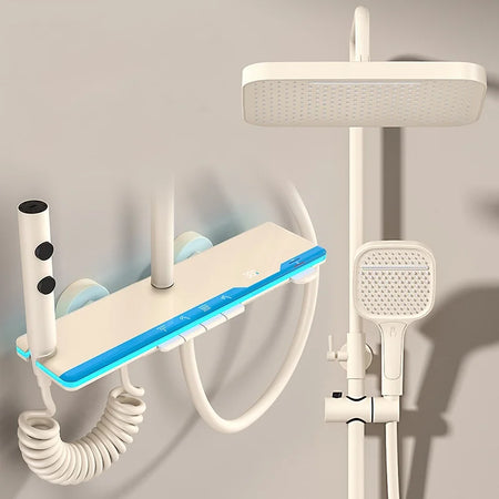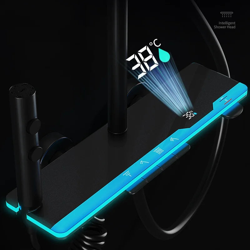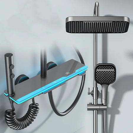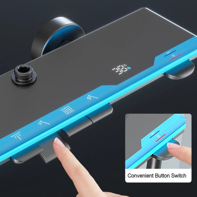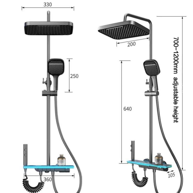 Komplet za prikaz temperature tuša – ambijentalna svjetlost — visinom prilagodljiv, kromirani stup tuša s integriranim prikazom temperature i ambijentalnom svjetlošću za povećanje sigurnosti i stila u vašoj kupaonici. Savršeno za moderne tuševe koji trebaju jasnu povratnu informaciju o temperaturi i elegantan kvadratni profil.