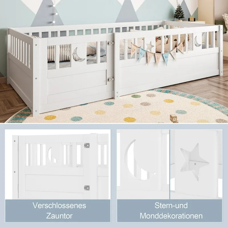 Otkrijte krevet s letvicama 90x190 s zaštitnom ogradom Star Moon Decor Minimalist—šarmantno, sigurno i funkcionalno rješenje za spavanje koje raste s vašim djetetom. Završeno u čistoj bijeloj boji, ovaj minimalistički okvir ima razigrane naglaske zvijezda i mjeseca koji potiču maštu dok održavaju smiren i čist izgled u svakoj dječjoj sobi. Sigurnost je na prvom mjestu: brava za sigurnosnu ogradu, zaštitna šina pune dužine i čvrsta letvičasta osnova rade zajedno kako bi smanjili rizik od padova i pružili mir za užurbane noći i živahne dane. Jednostavna montaža kreveta i izdržljiv dizajn čine ga praktičnim izborom za obitelji koje traže stil, sigurnost i vrijednost.