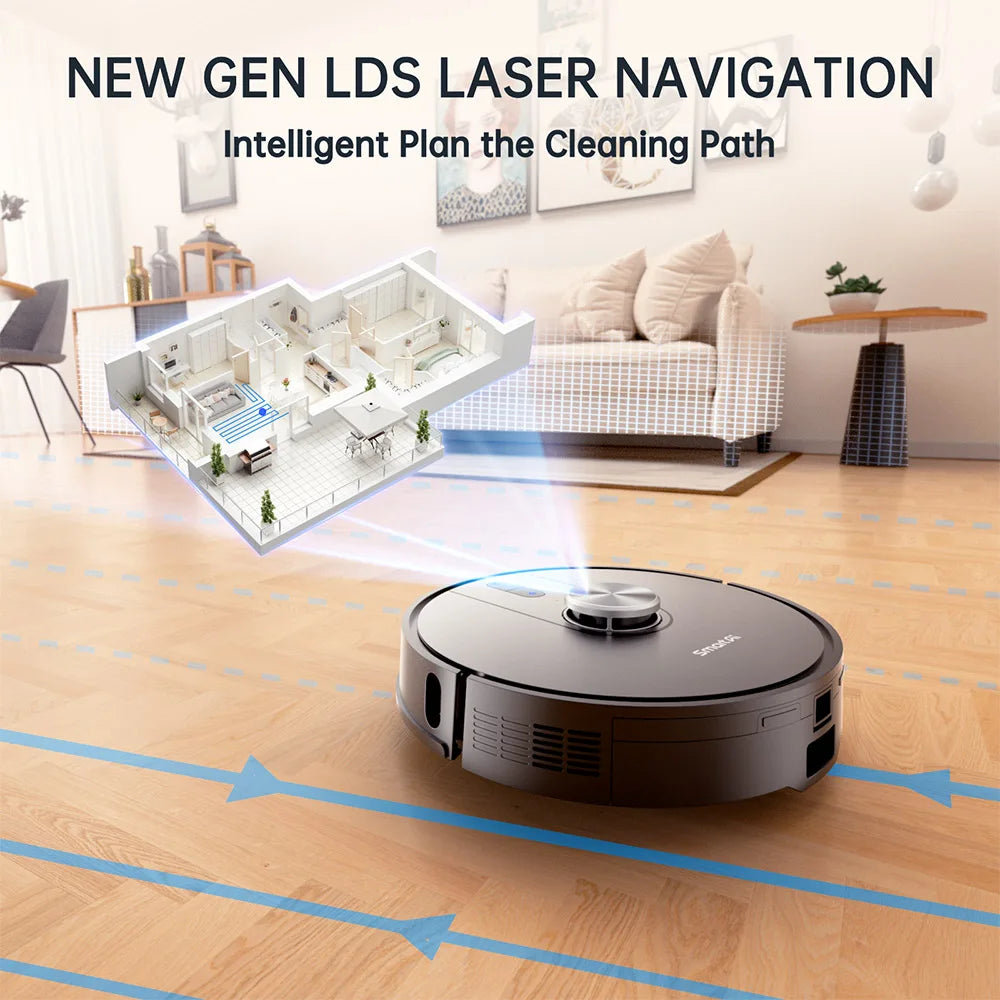 - Pametno, učinkovito čišćenje: LDS Laser Radar Navigacija pruža brzo, precizno mapiranje, inteligentno planiranje ruta, izbjegavanje prepreka i senzore za ponore kako bi se spriječili padovi. Uzorak čišćenja u šahovnici ne ostavlja skrivene džepove prašine.
