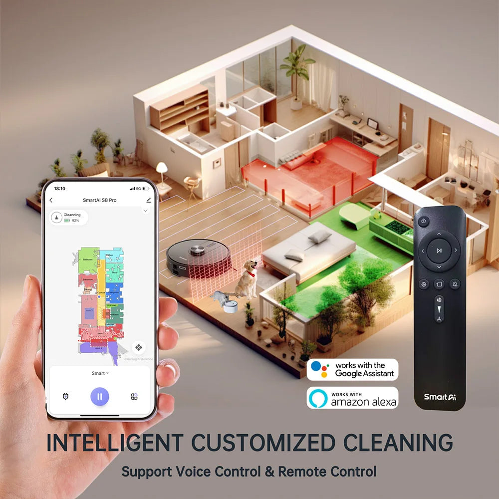 - Kontrola bez ruku: Koristite aplikaciju za zakazivanje, ciljanje specifičnih prostorija, postavljanje virtualnih zidova ili izbjegavanje područja. Glasovna kontrola radi s Google Assistantom i Amazon Alexom, a daljinski upravljač je uključen za jednostavno upravljanje.