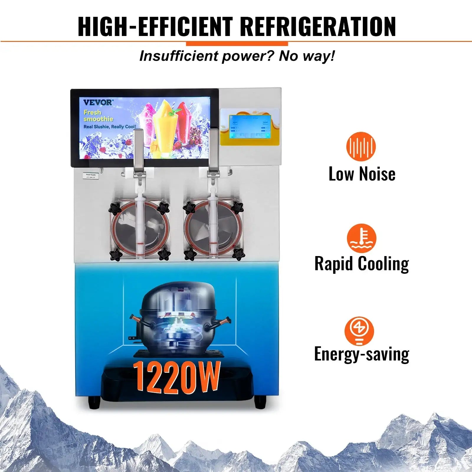 8L Slushy Margarita Machine Double Bowl Smoothie je profesionalni uređaj za pripremu sladoleda s dvostrukom zdjelom, dizajniran za lako rukovanje velikim brojem ljudi. S dvije zdjele od 8L i snažnim kompresorom od 1220W, možete stvoriti do 26–32 litre osvježavajućeg sladoleda po satu i 15–21 litru alkoholnih pića, što ga čini savršenim za barove, catering događaje, bankete ili živahna okupljanja kod kuće. Njegova kompaktna veličina savršeno se uklapa na pult, dok njegova izdržljiva konstrukcija izdržava zauzete uslužne periode.