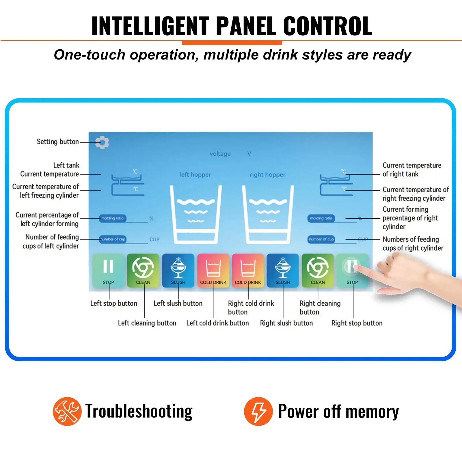 dizajniran za pouzdanost i vizualnu privlačnost: digitalni ekran, izmjenjiva svjetlosna kutija i pametna kontrolna ploča omogućuju vam preciznu kontrolu nad temperaturom i protokom. Odaberite između sladoleda i hladnih pića kako biste brzo poslužili razna pića. Robustan sustav hlađenja osigurava da pića ostanu hrskava i svježa tijekom noći, dok tiha radna operacija održava ugodnu atmosferu u vašem prostoru.