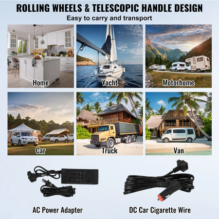 - Idealno za putovanja i život na otvorenom: Opremljeno kotačima i teleskopskom ručkom za jednostavan transport, plus adapterima za korištenje kod kuće, na čamcu, u kamp-prikolici, automobilu, kamionu ili kombiju.