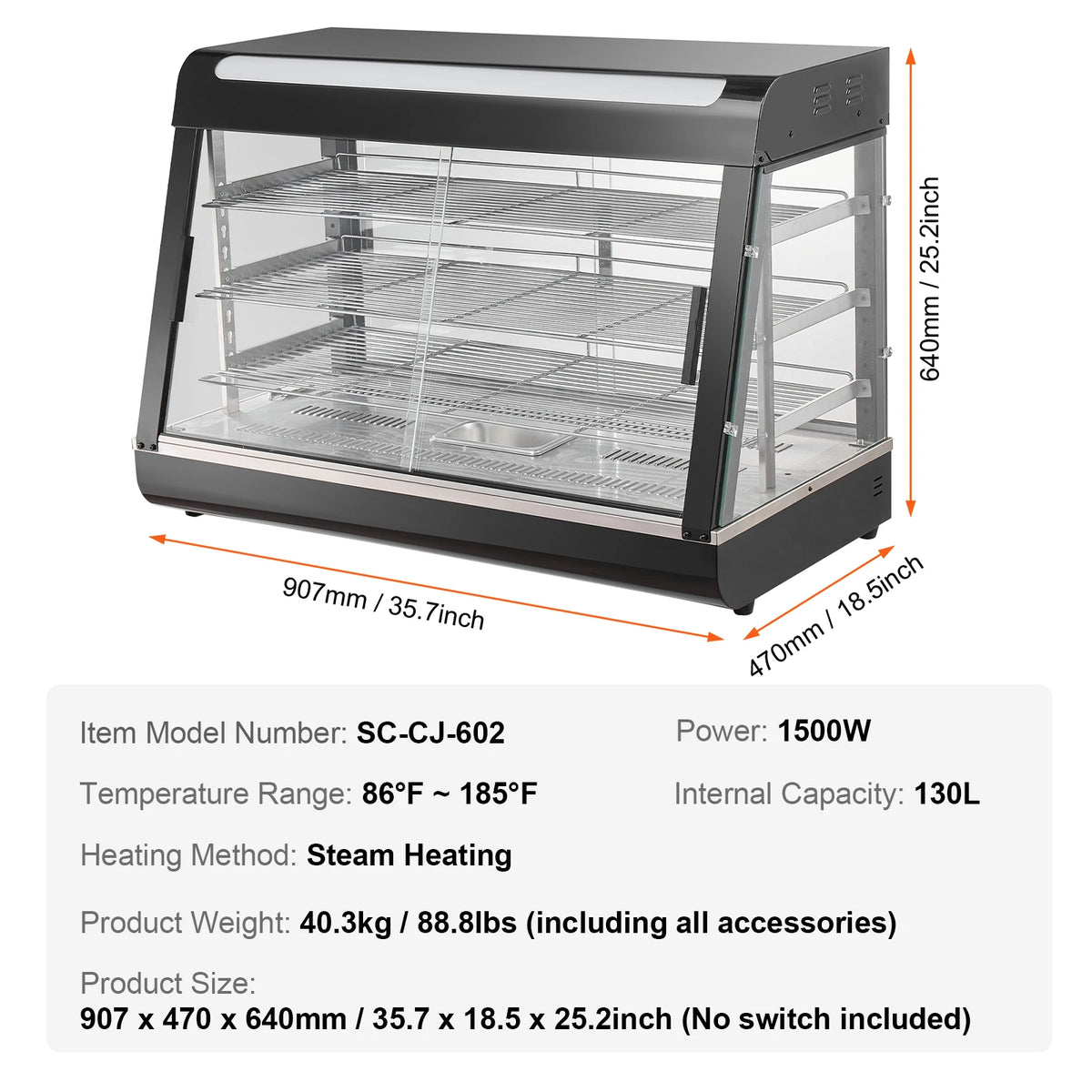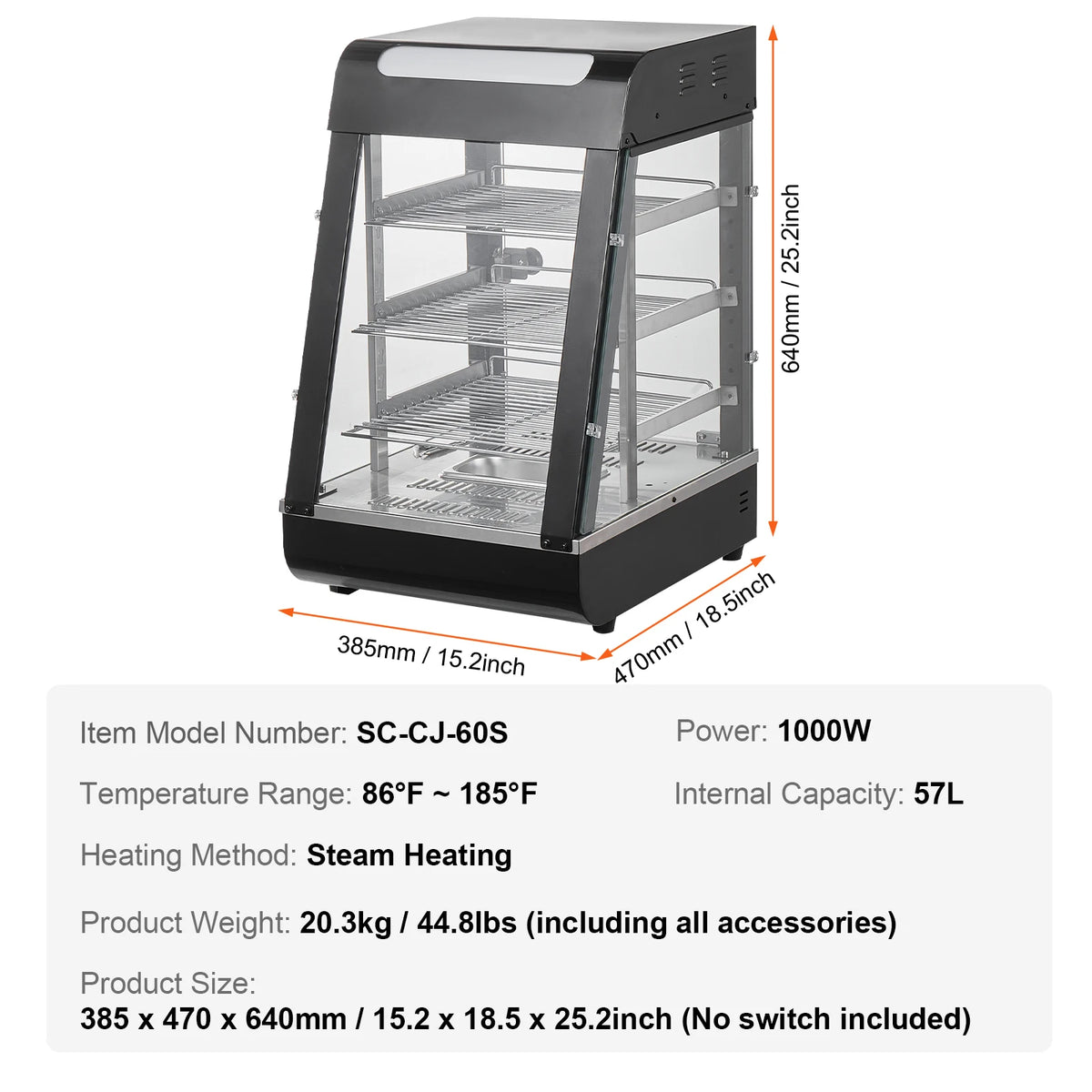 Dva prostrana nivoa nude dovoljno prostora za razne stavke, od pizza i hamburgera do pržene piletine i hot dogova. Kontrolna tipka za temperaturu pruža širok raspon od 86°F do 185°F (30-85°C), omogućujući vam prilagodbu topline različitim namirnicama. Unutarnji senzor temperature osigurava preciznu izolaciju i stabilne temperature, sprječavajući pregrijavanje. Vlažnost se održava pomoću dvije ugrađene posude za vodu od 0,5L, pomažući u očuvanju vlage i teksture dok se hrana izlaže. Zakrivljeni prednji dio i ojačano kaljeno staklo pružaju jasnu vidljivost i privlačnu prezentaciju koja privlači pažnju kupaca.